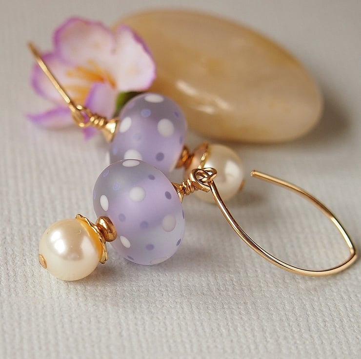 Beautiful handmade earrings featuring artisan lampwork glass beads complimented by Swarovski ivory glass pearls with 14kt gold beads, bead caps, and ear wires I made especially for these earrings.