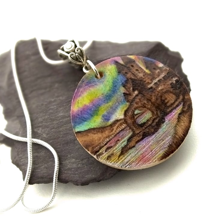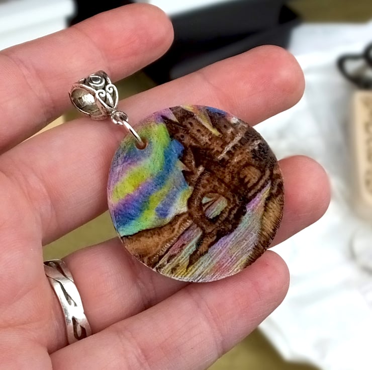 The pendant is a slimline wood disc, and it measures approx. 3.2cm in diameter. The design is sealed with a few coats of varnish to protect it. To care for your pyrography pendant, store in a box or roll when not in use, keep nice and dry and avoid spraying with perfume,