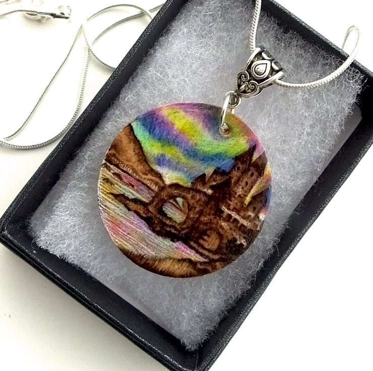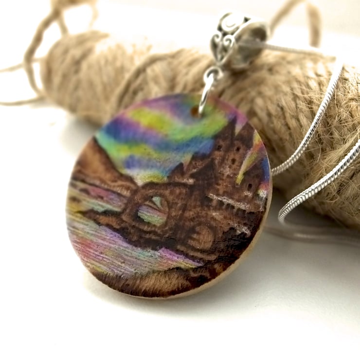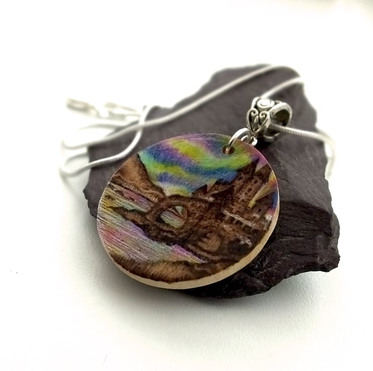 A lovely small lightweight circle shaped wooden pendant, with a seaside castle theme, with a back drop of the Northern Lights. Hand burned using pyrography and hand coloured with beautiful shades of purple, green and pink prismacolor pencils.