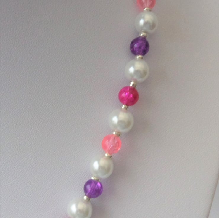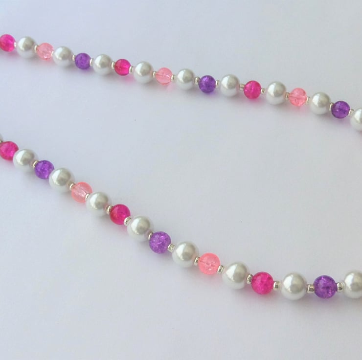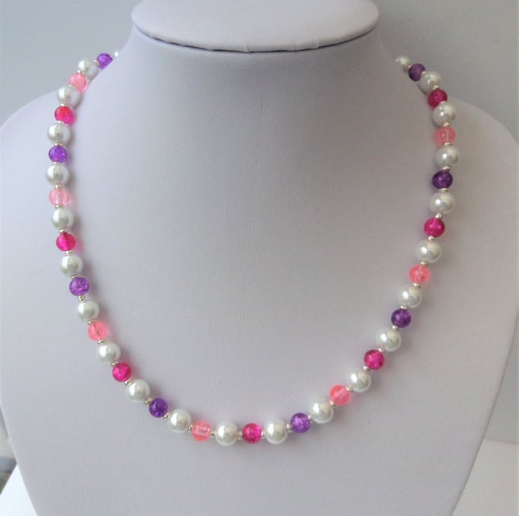 Necklace made with 8mm white pearls and 6mm dark and light pink and purple crackle beads and metallic silver seed beads.