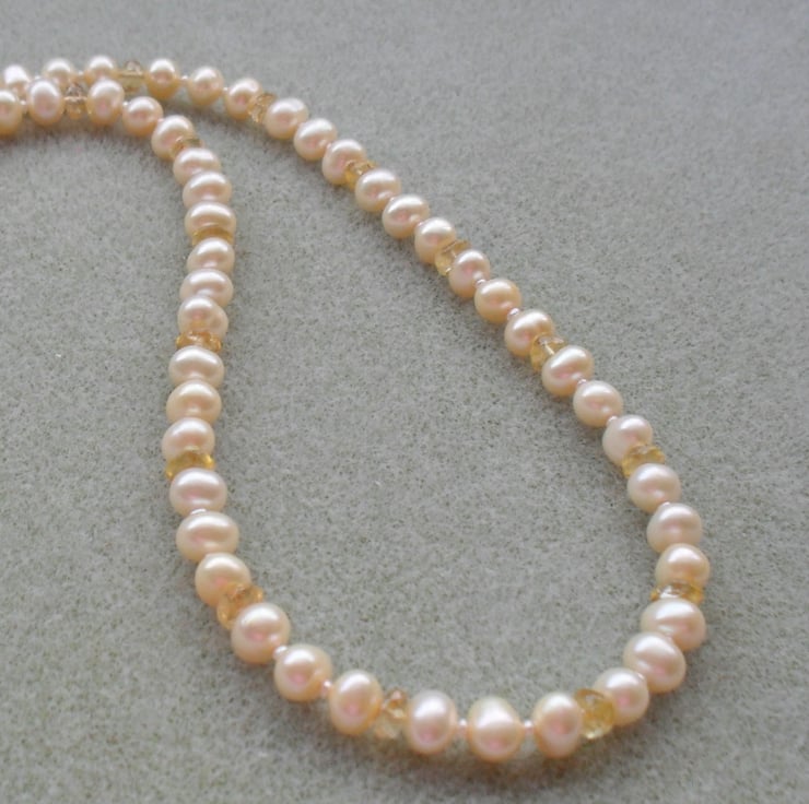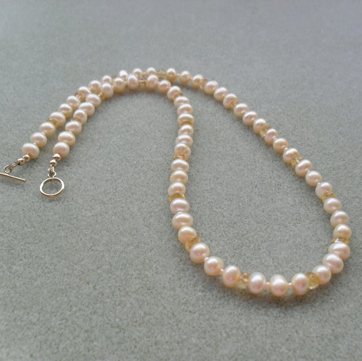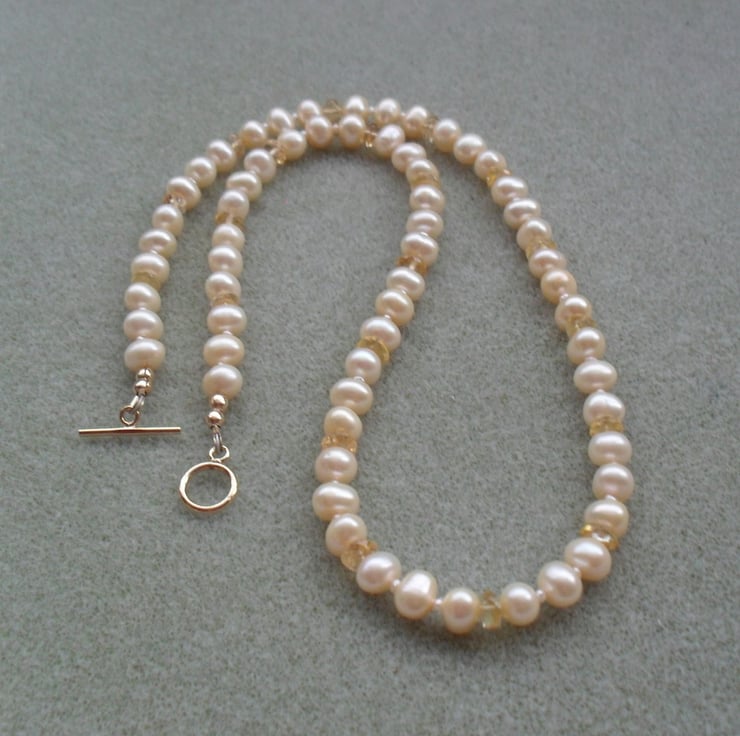 Champagne freshwater pearls with small citrine semi precious gemstones and tiny ivory pearl seed beads are beaded onto beading wire and attached to a gold filled toggle clasp.