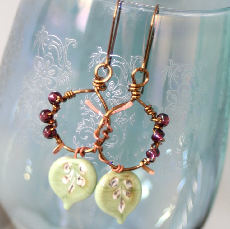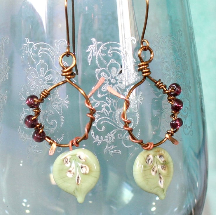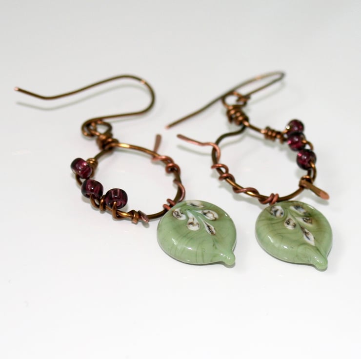 These unusual earrings are created from antique bronze wire to resemble a trailing vine complete with little red seed bead 'berries' and a beautiful lampwork glass 'vine leaf' created by Linsey Peck.