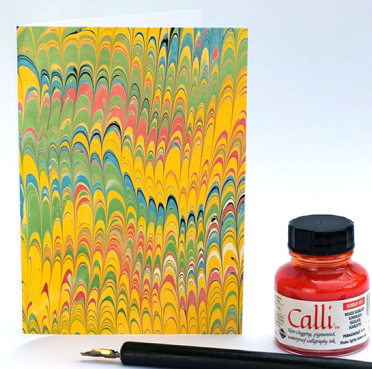 This is a colourful marbled note card featuring a traditional pattern known as a non pareil.