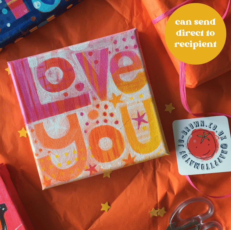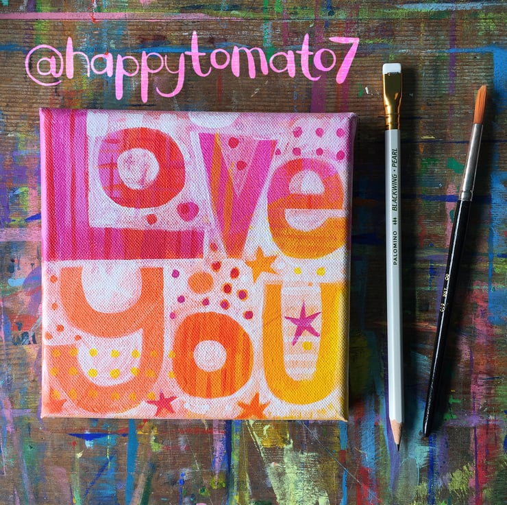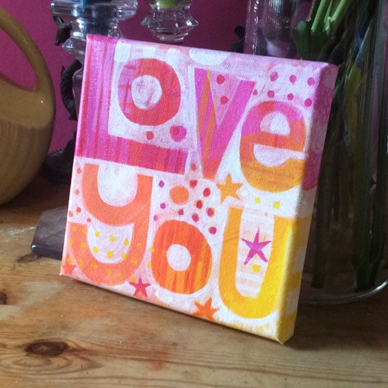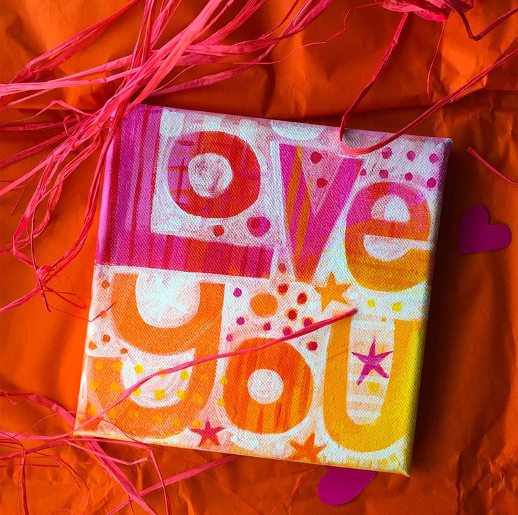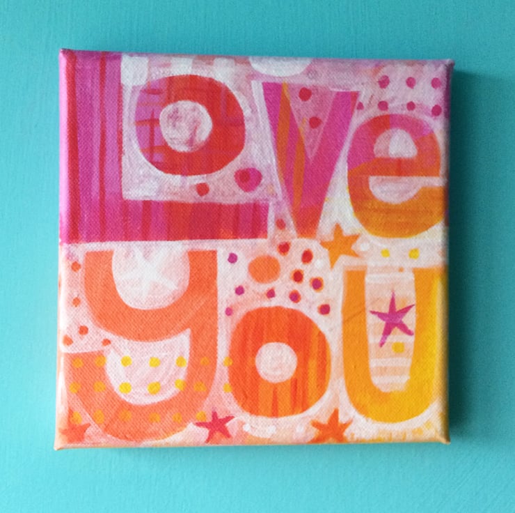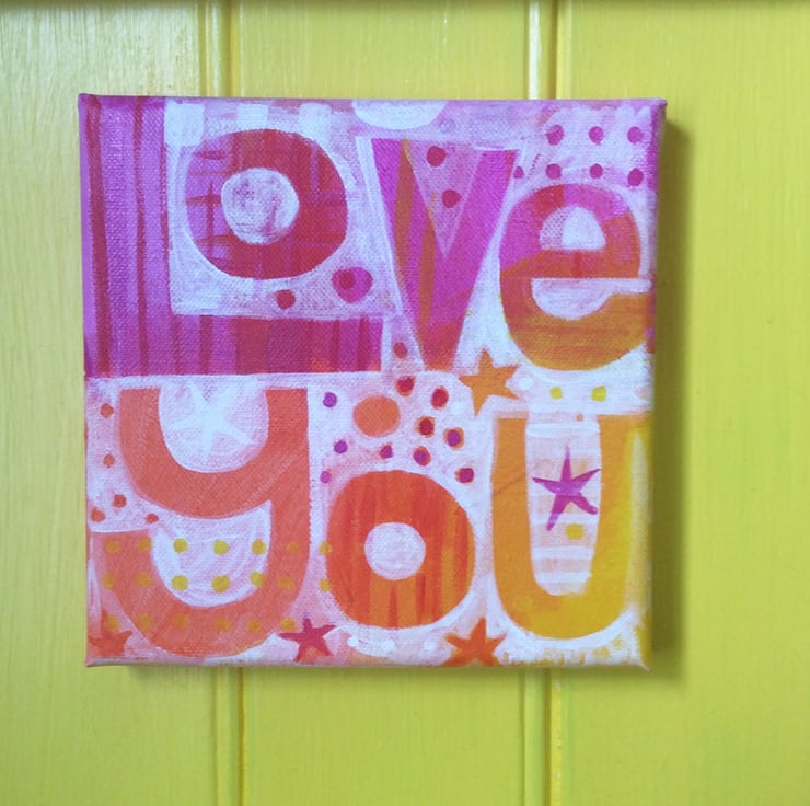 Love You cute square original painting approx 6in square, in pinks oranges yellow and white a love token a valentine's gift or just a gesture