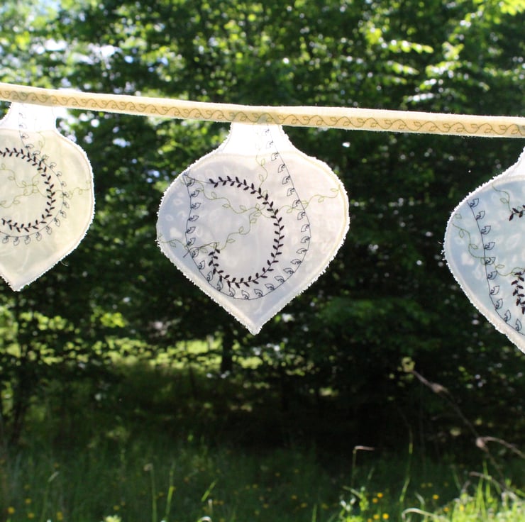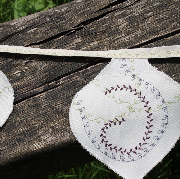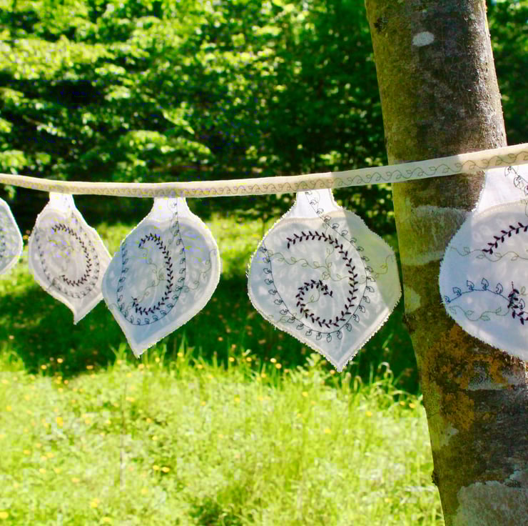 The reverse side has a machine sewn pattern in complimentary colours in a combination of leaf stitches. So very delicate and beautiful...I can't decide which side is my favourite! Stitched onto a 100% cotton canvas type fabric to give the bunting stability and even though it will flap in the wind it won't want to fly away! Each tree shape curls a little around the edges giving every piece of bunting the look of a leaf being tickled on the breeze.