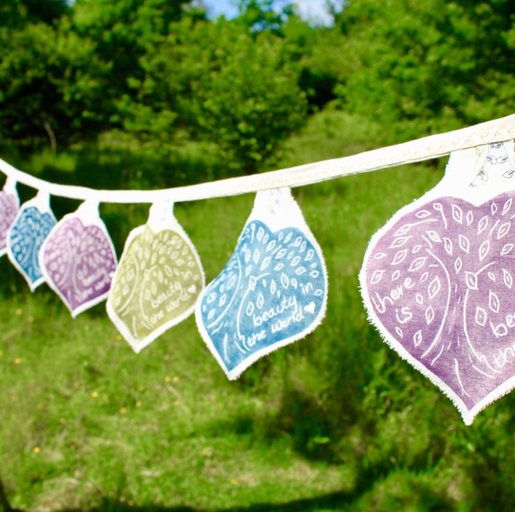 I begin each series of bunting by designing a new Lino print. With this bunting in particular, I wanted to feel like leaves floating on the breeze. There are three different colours of my tree of life design. The words on the design say 'There is beauty in the world' It has a very delicate and pretty look and a feel of vintage with a touch of scandi, that my pieces tend to lean towards.