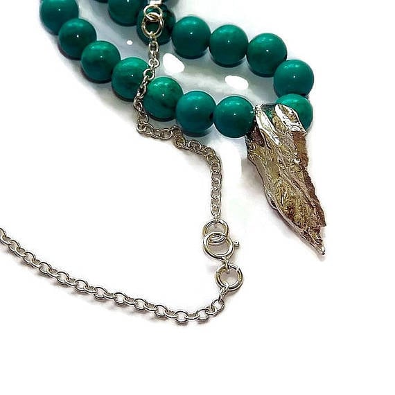 A modern necklace featuring an abstract sterling silver pendant and round, stabilised turquoise beads.