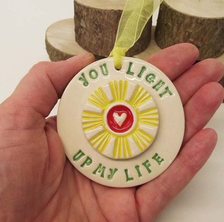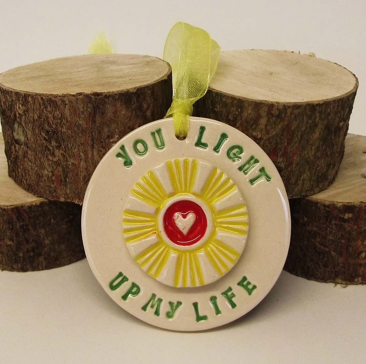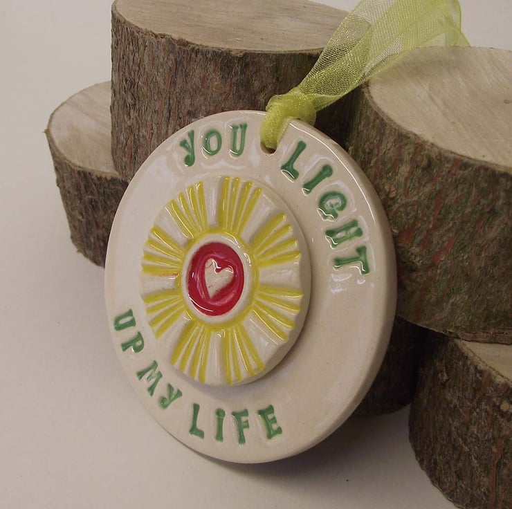 This cute little hanging decoration has been made from white earthenware clay and imprinted with the words - You Light up my Life.
