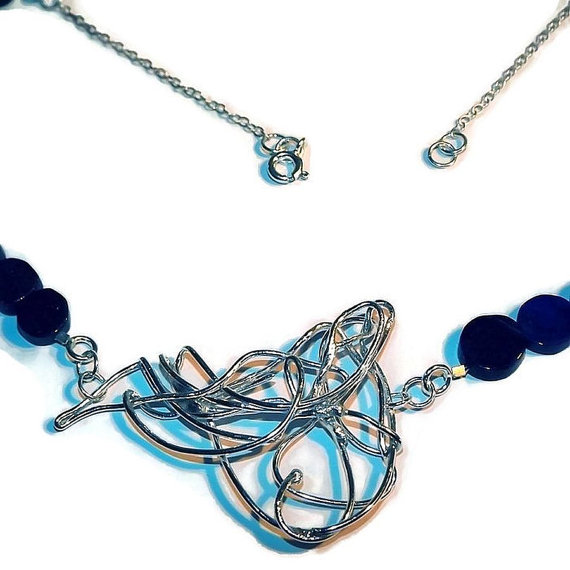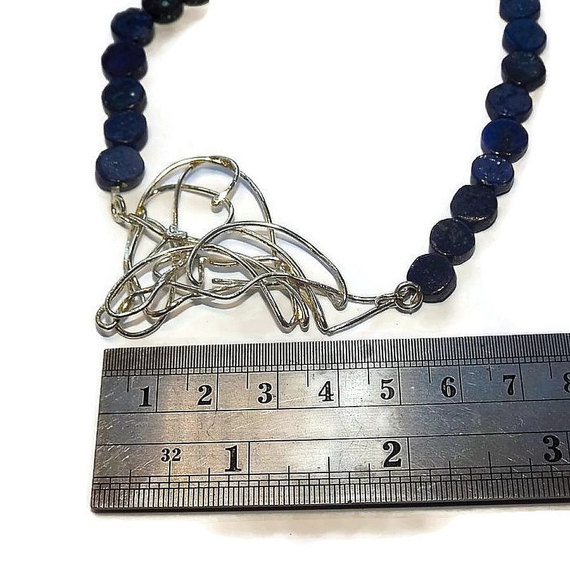 A modern gemstone necklace featuring an abstract scribble of sterling silver wire surrounded by natural lapiz lazuli coin beads.