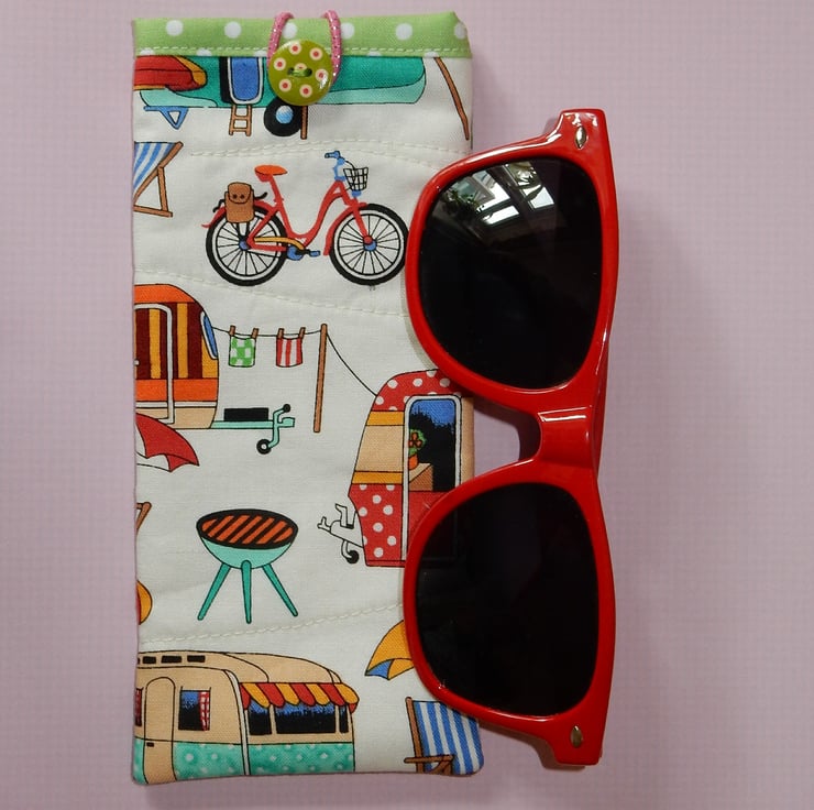 This is a slip in style case for your glasses or sunglasses, with a button and elastic fastening.This is made from a cotton print fabric featuring caravans and camping equipment, and has a toning spot lining.. It also has a layer of wadding for protection. The case measures approx 3 x 6.75 inches.