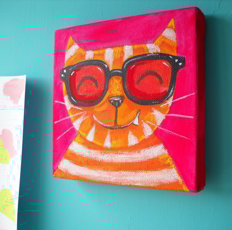 Ginger cat original painting by Jo Brown. Wearing NHS glasses (please save our NHS) Fun quirky painting with bright colours (including some fluorescent pink on background) perfect for brightening up anyone's day