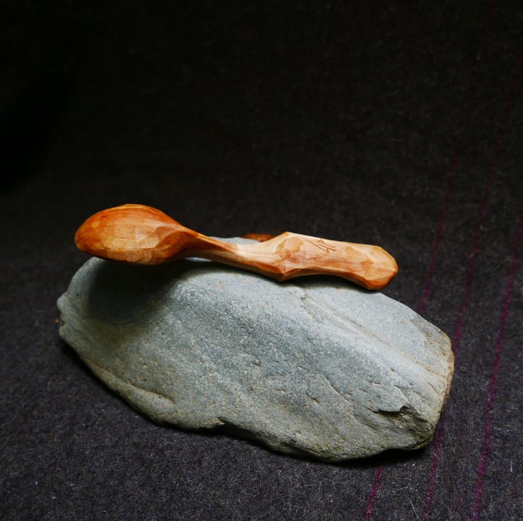 The spoon is about 7 1/2 inches long. Although a plain, traditional eating spoon, it has masses of character owing to the wombly grain path.