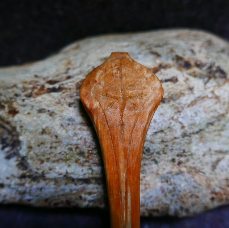 This spoon spoon is about 8 inches long. It has a chunky handle boss, a simple relief carved design and slight pale spalting of the wood.