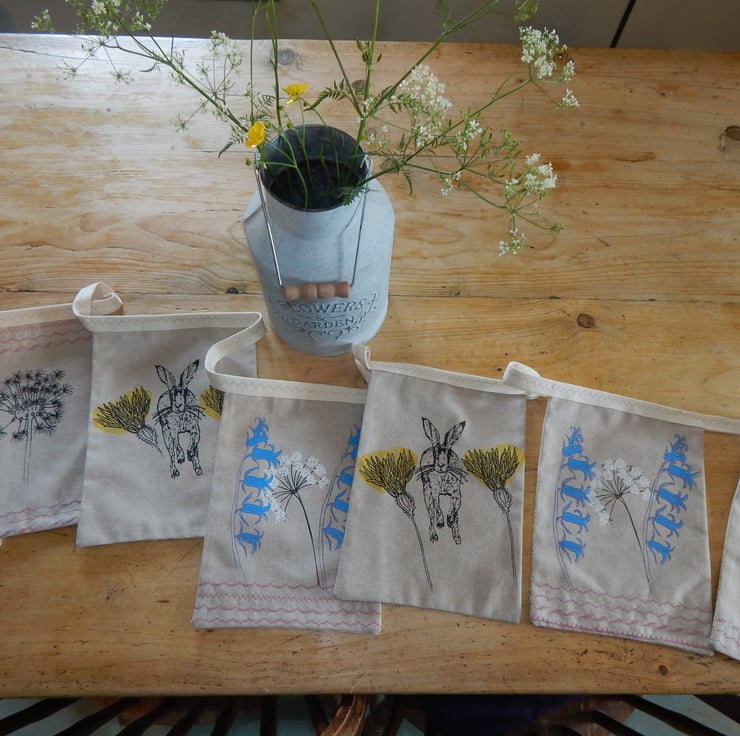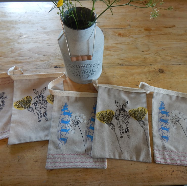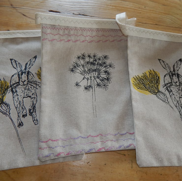 The rectangles contain running hares, dandelion clock, yellow wild flowers, bluebells and cow parsley. Some rectangles have decorative pink machine stitching.