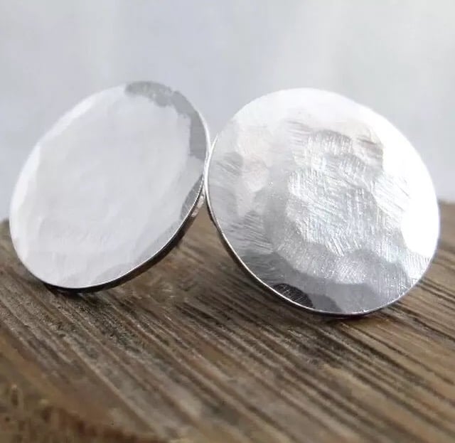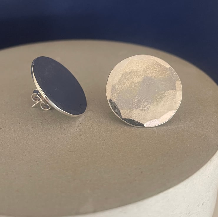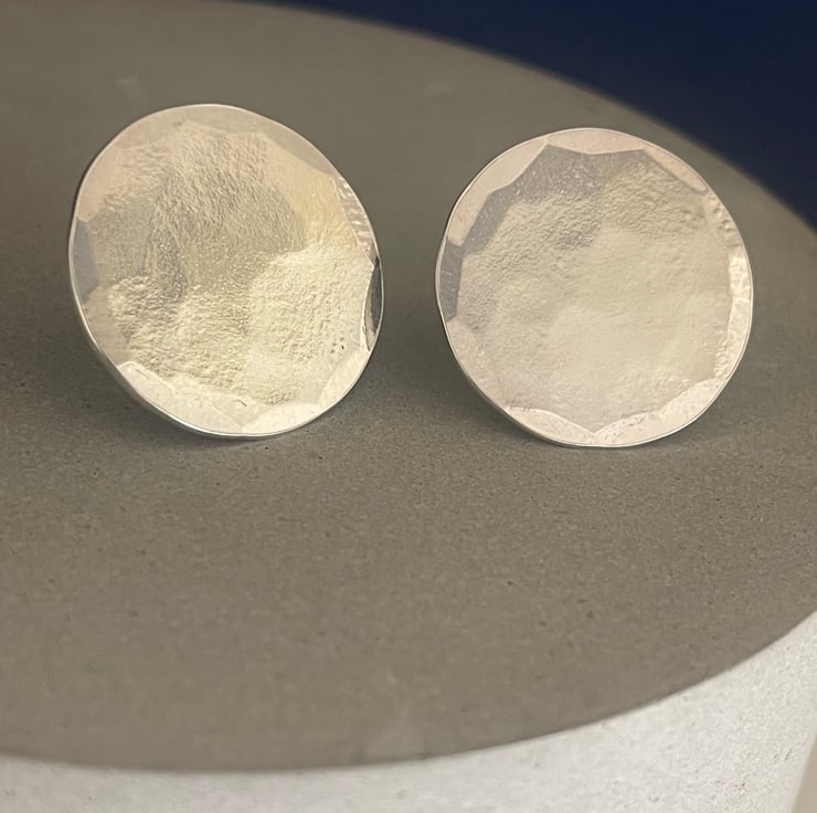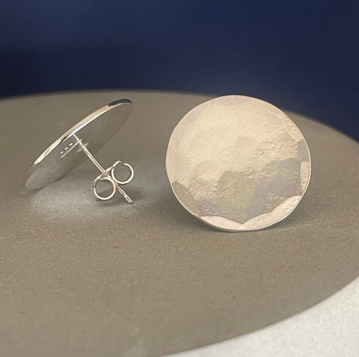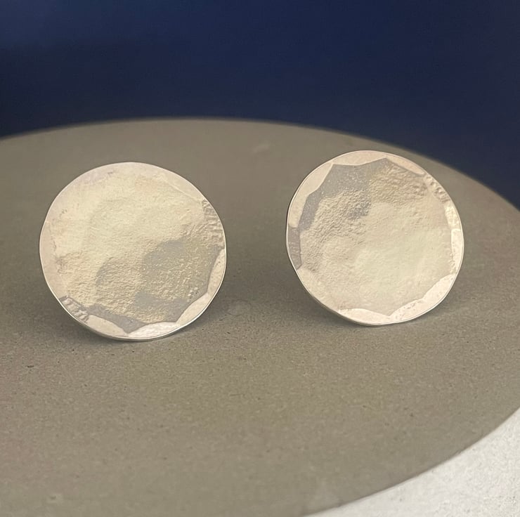 A lovely pair of large round disc ear stud earrings handmade from 925 sterling silver. Cut out by hand from solid 1mm thick silver sheet then hammered to create a textured surface.