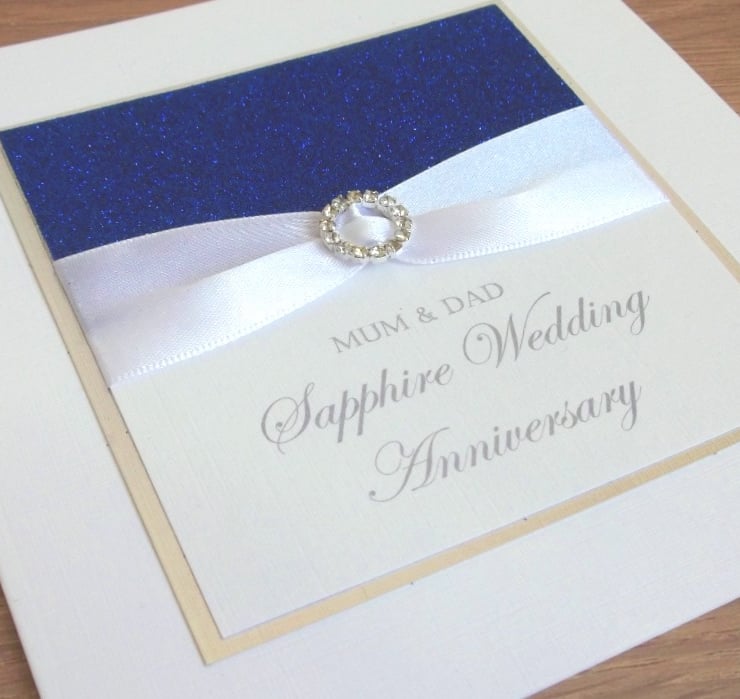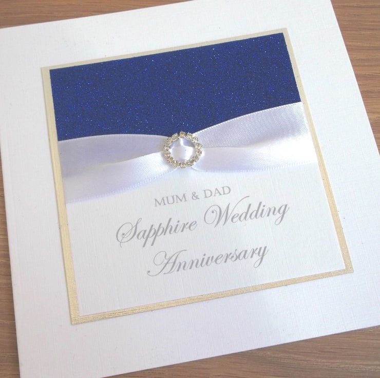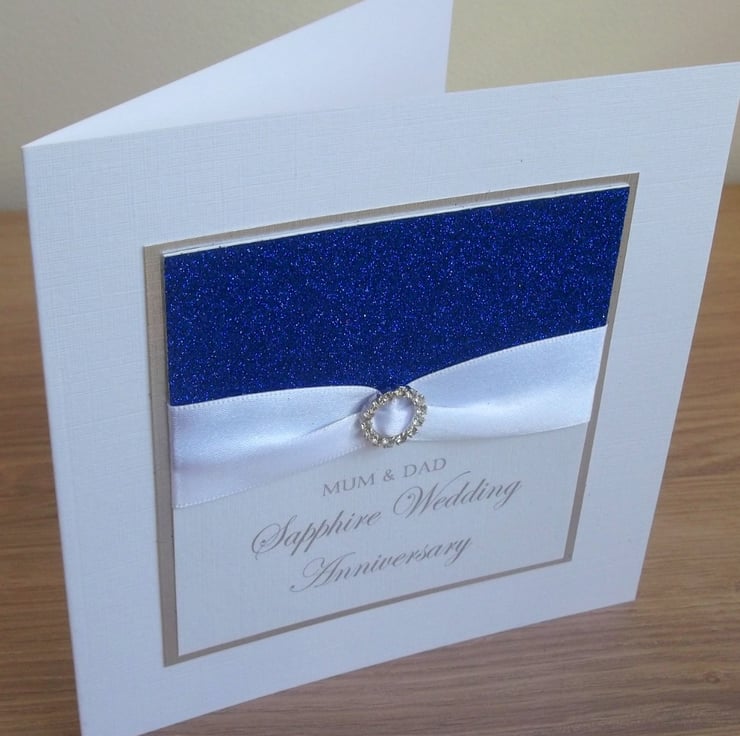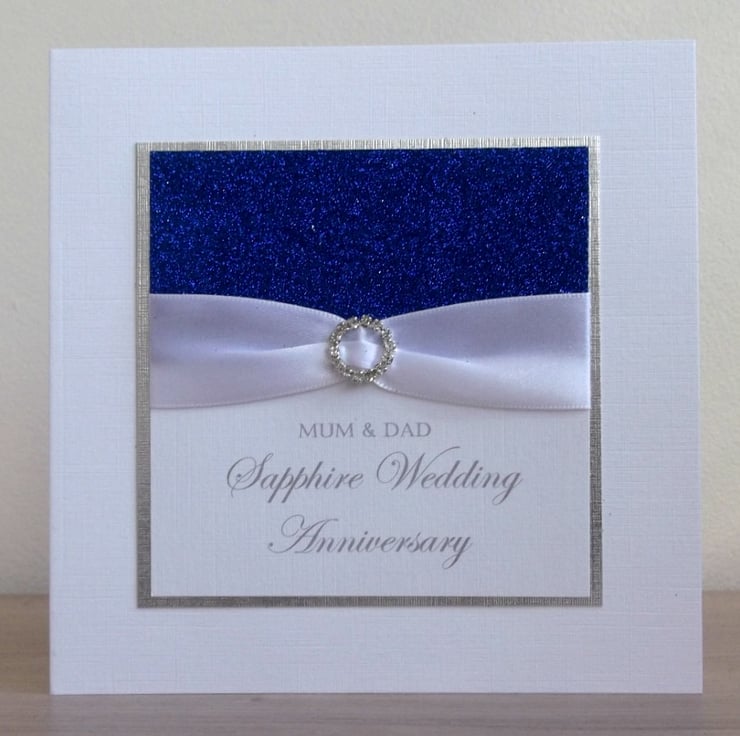 Handmade designer 65th sapphire anniversary card, with a clean and simple design. A high quality, white card base with a panel of blue glimmer paper, white ribbon and diamante buckle. You can personalise this card with any names and if needed, I can add a date too. Just leave the details in the box provided as you check out. This design can also be adapted for any special anniversary - just ask me or see my other listings.