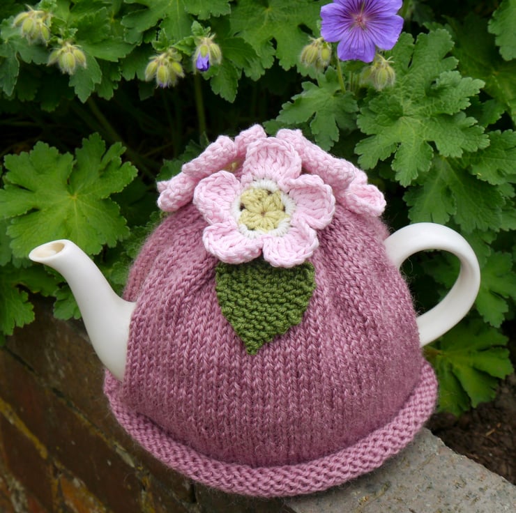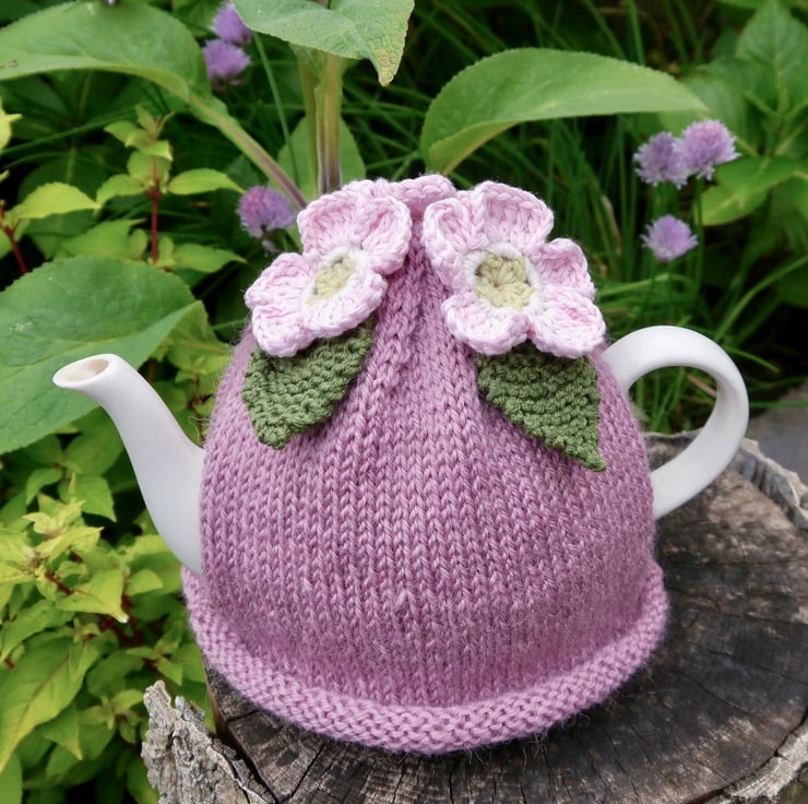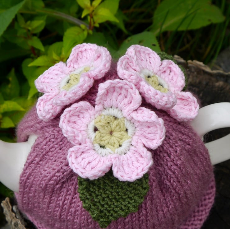 This hand knitted pink teacosy has three pretty pale pink, cream and yellow crochet flowers attached. There are also three knitted green leaves.