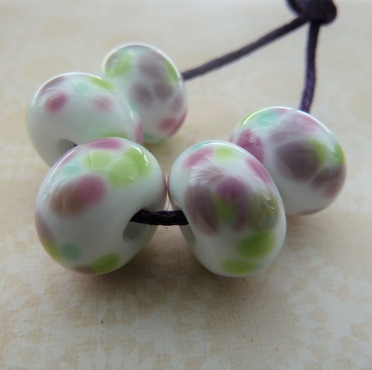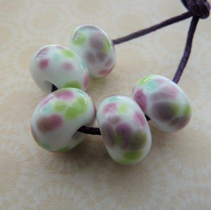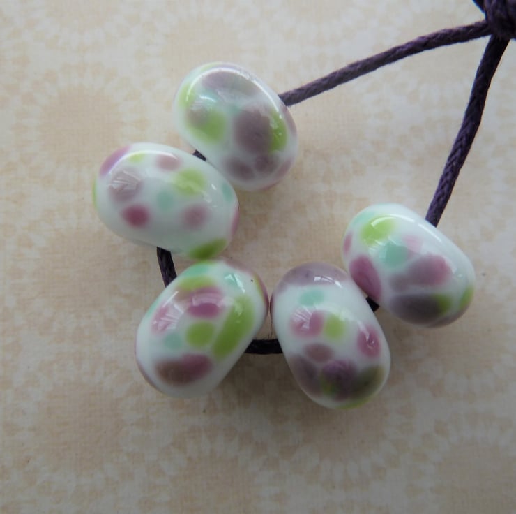 A set of 5 lampwork glass beads made with white glass and rolled in frit.