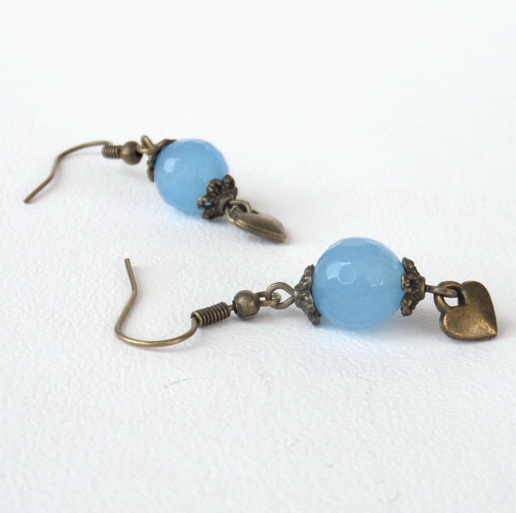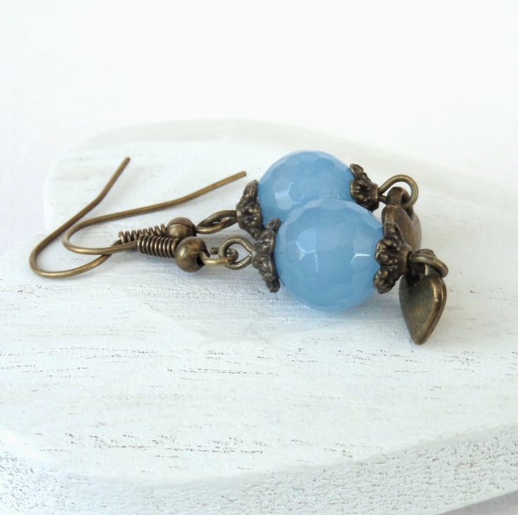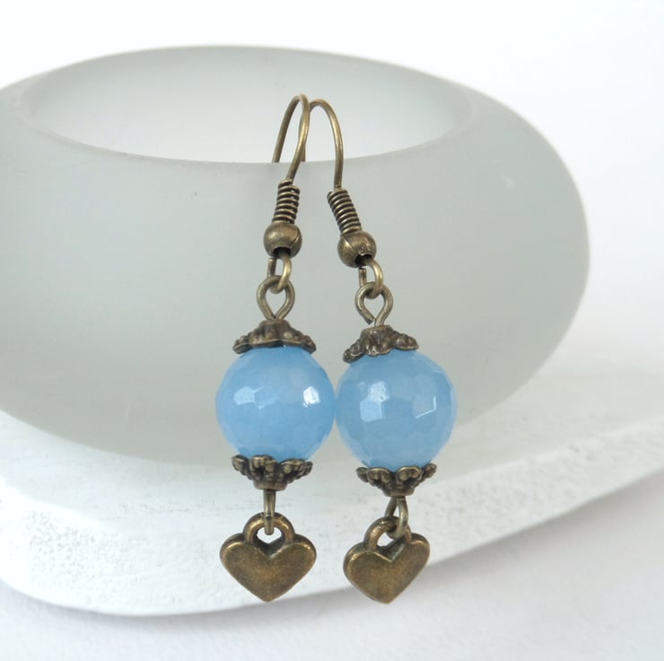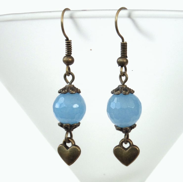 Stunning cornflower blue faceted quartz look great hanging from bronze beadcaps and wires. The earrings are completed with a pretty heart charm embellishment.