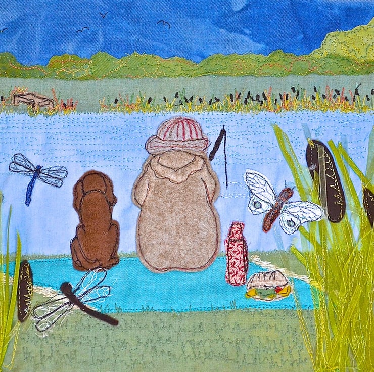 This Father's day card shows a patient fisherman beside the river amidst the bulrushes, alongside a dog, picnic, dragonfly and butterfly, fishing and waiting for his big catch! Perfect for any dad who loves to go fishing.