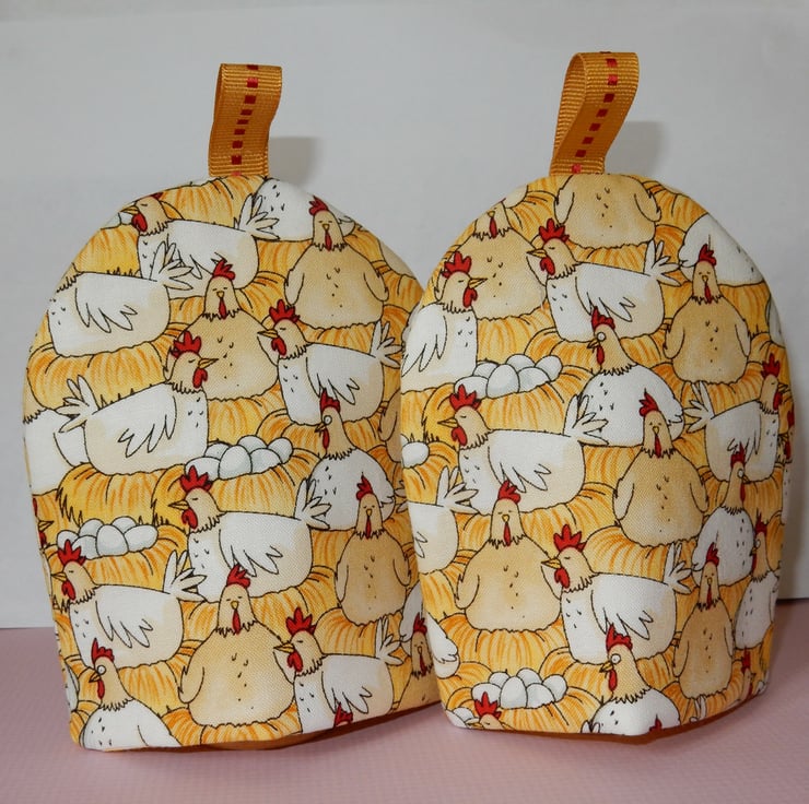 This listing is for a pair of generously sized egg cosies which will fit any egg cup. They each measure approx. 5.5 inches high x 4.5 inches wide and are made from a cotton fabric, which features hens and eggs. They have a layer of wadding and a spot lining. There is a ribbon on top for decoration and easy removal of the cosy.