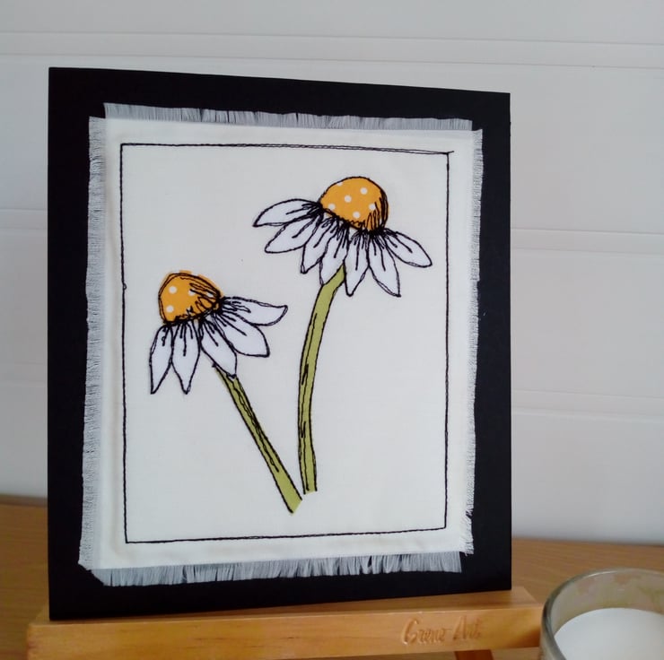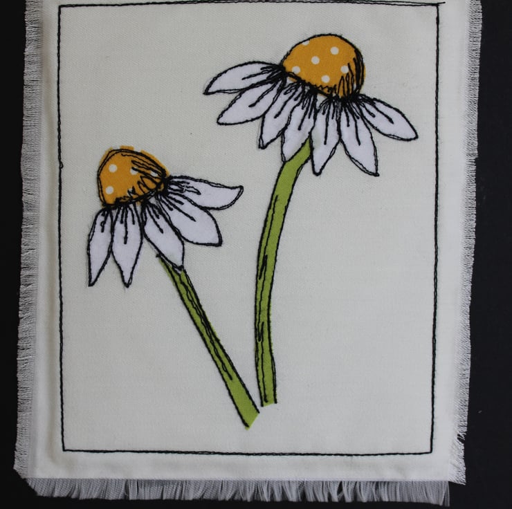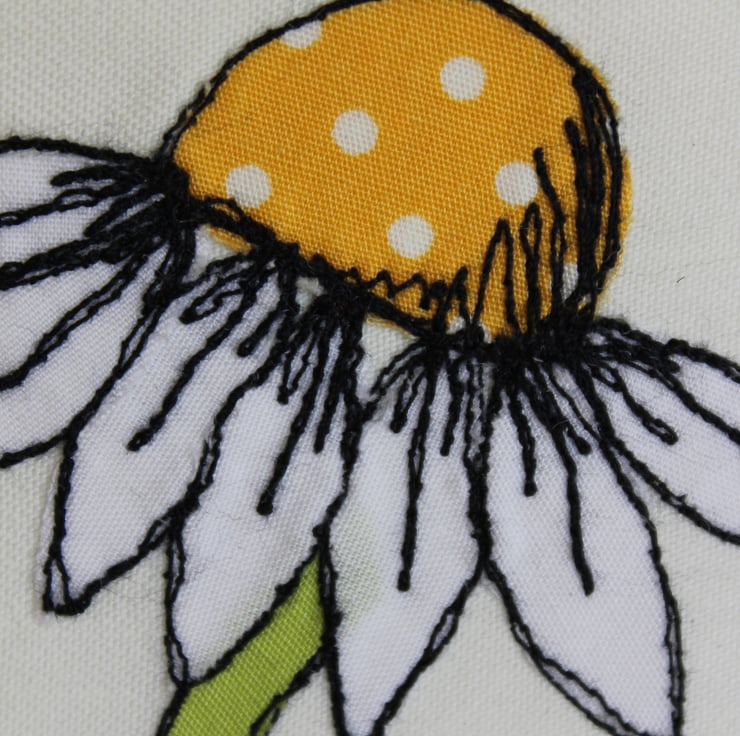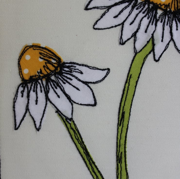 This striking textile art picture designed by myself, features a pair of summer daisies; made using hand cut pieces of coloured fabric, applique and free motion machine embroidery techniques.