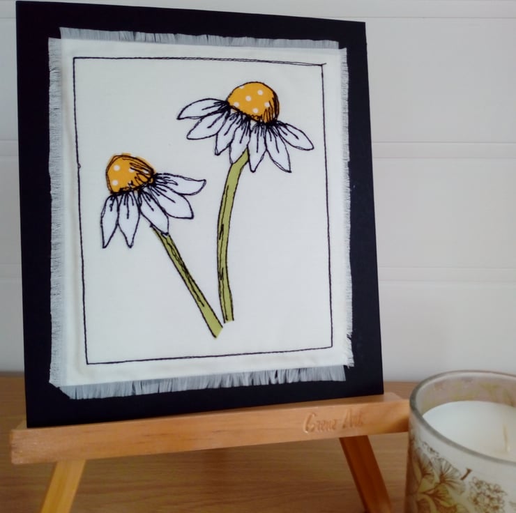 A machine stitched fine border surrounds the daisies to frame the image, and the edges are frayed slightly to add a rustic feel.