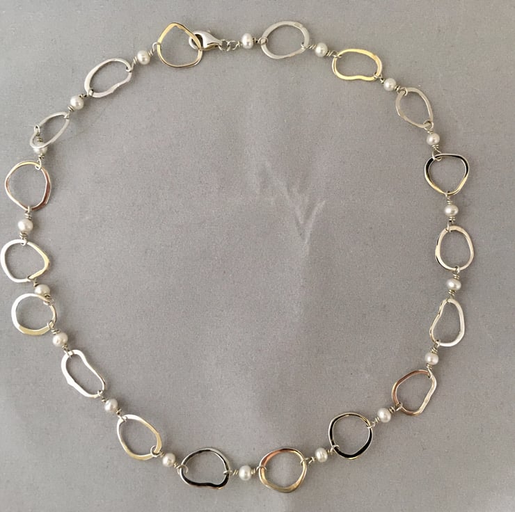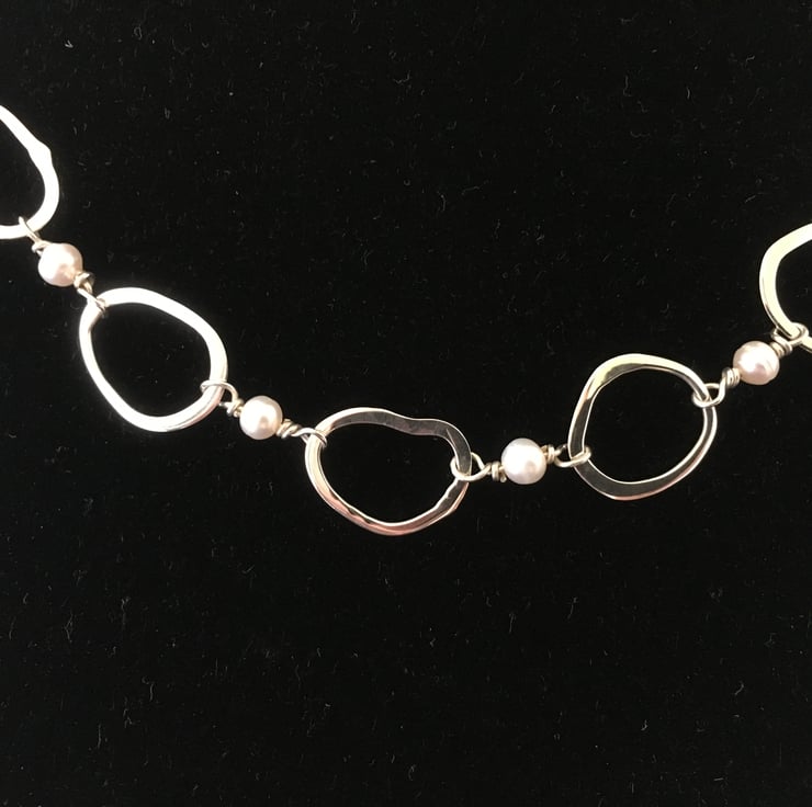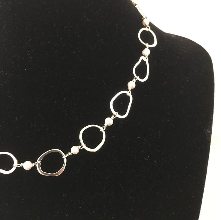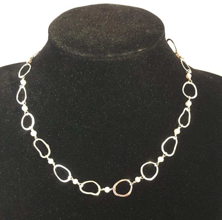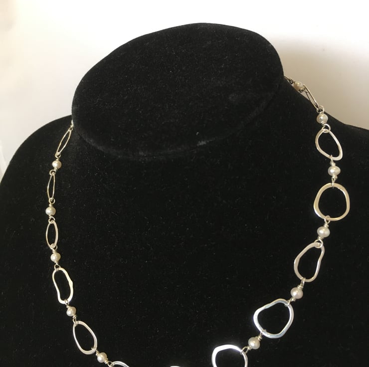 Sterling silver oval links with pearl spacer beads combine to make this contemporary necklace.