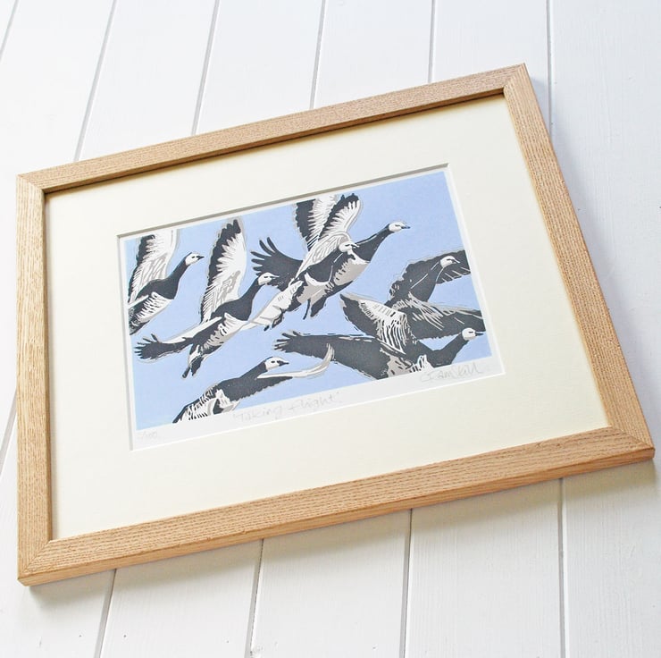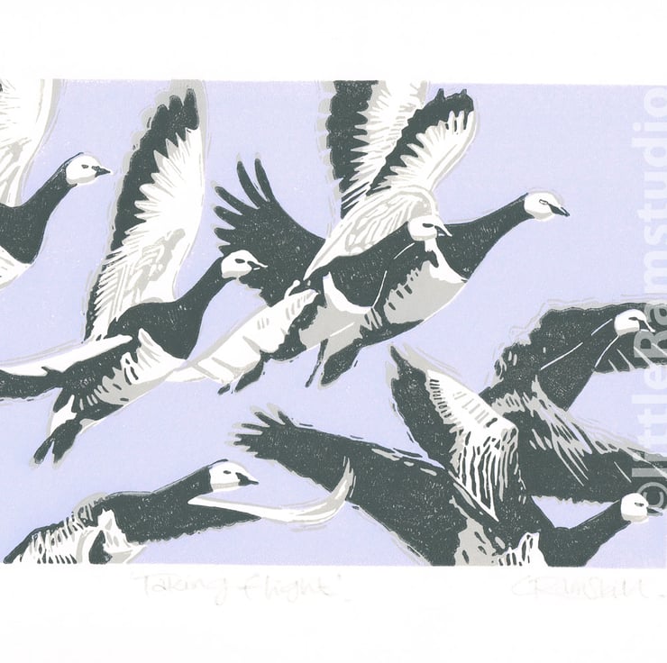 Original, hand printed limited edition linocut of Barnacle geese titled, 'Taking flight', printed on hand press in blue, soft grey and charcoal ink. Signed, numbered and titled in pencil by the artist.