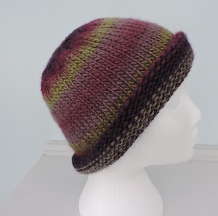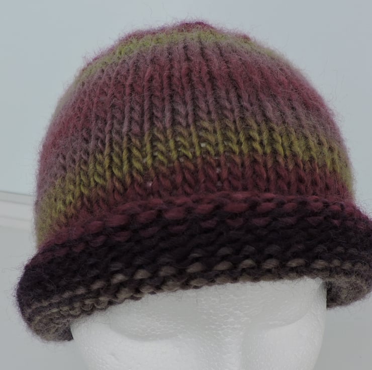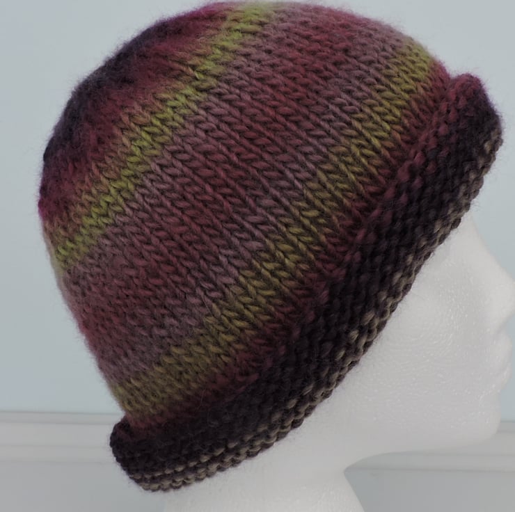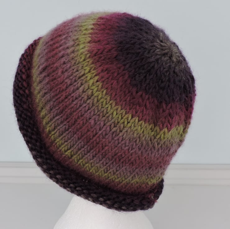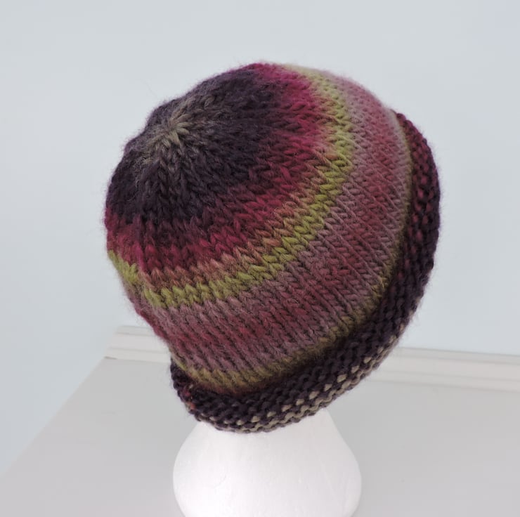 For this adults knitted beanie hat I've used a chunky wool and acrylic yarn. Graduating colours of purple, mauve and olive