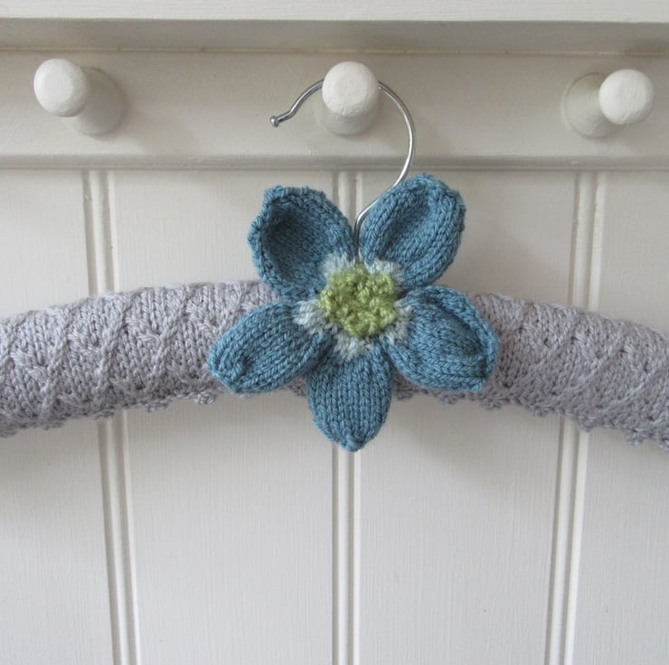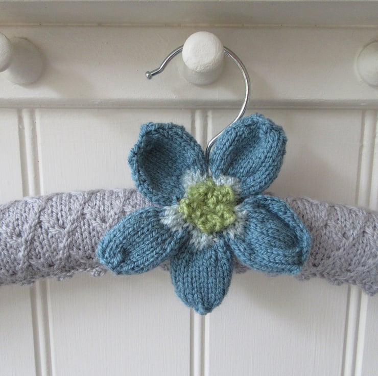 A beautifully hand knitted pewter silver grey coloured coat hanger with an oversized Himalayan blue poppy sewn just under the metal hook. The wooden hanger is wrapped in wadding and then encased in a hand knitted cover using a trellis stitch in a pewter silver grey coloured yarn, finished at the bottom edge with a self coloured crocheted picot edging. The oversized blue poppy inspired flower has a green and pale blue centre and 5 large blue petals, securely sewn on the front. A more contemporary design, appealing to the young at heart, but nevertheless a perfect addition to any bedroom decor.