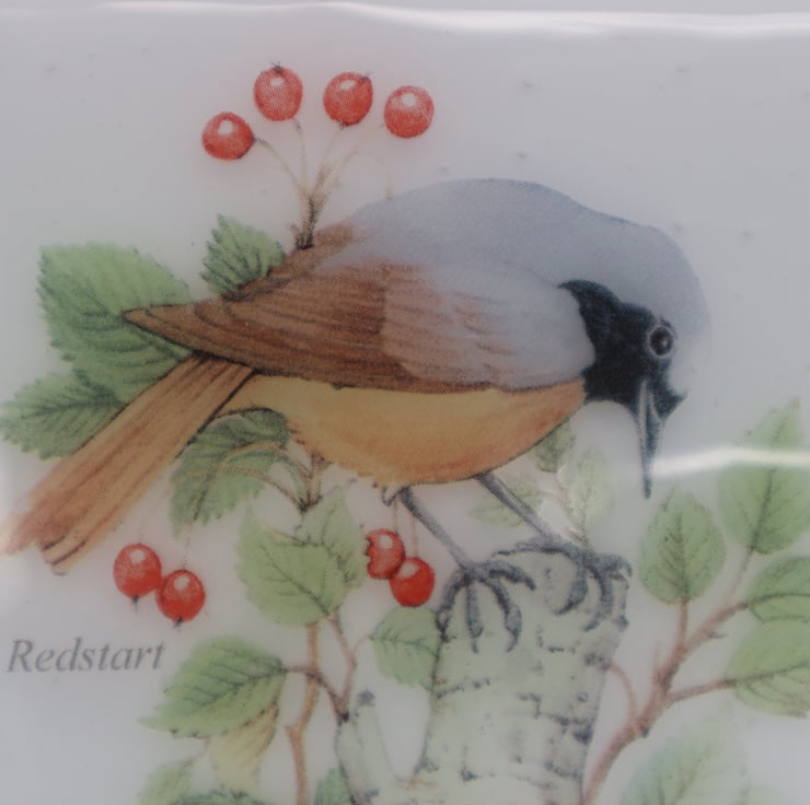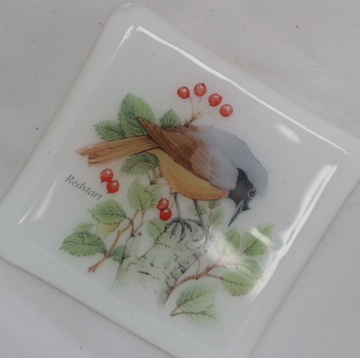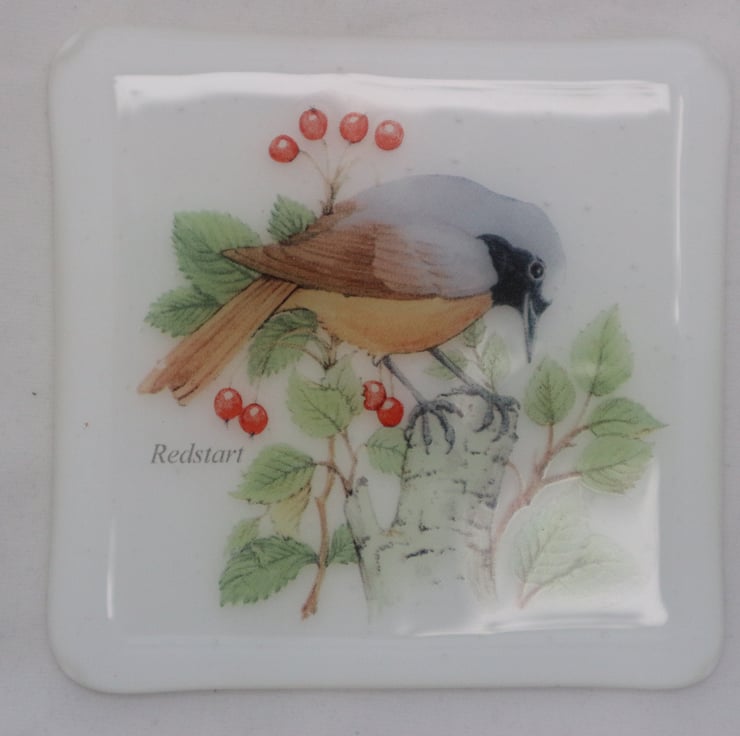 This coaster has a beautiful redstart design on white glass. It has been fully annealed to make it strong and is suitable for use with hot tea or coffee cups but not pans straight from the oven. It would make a great gift, secret santa or stocking filler.
