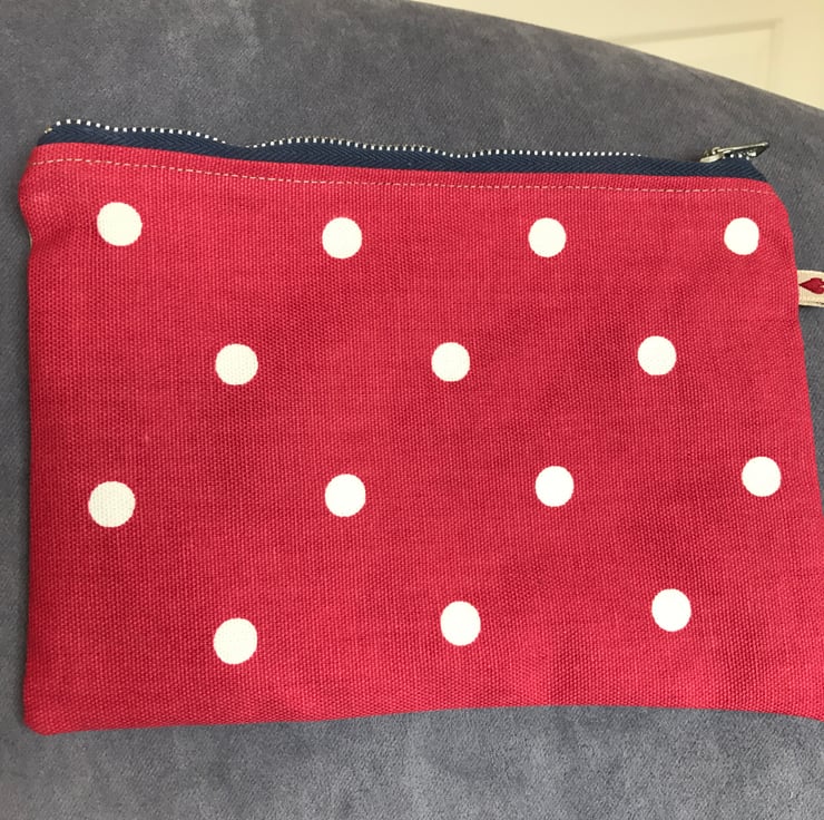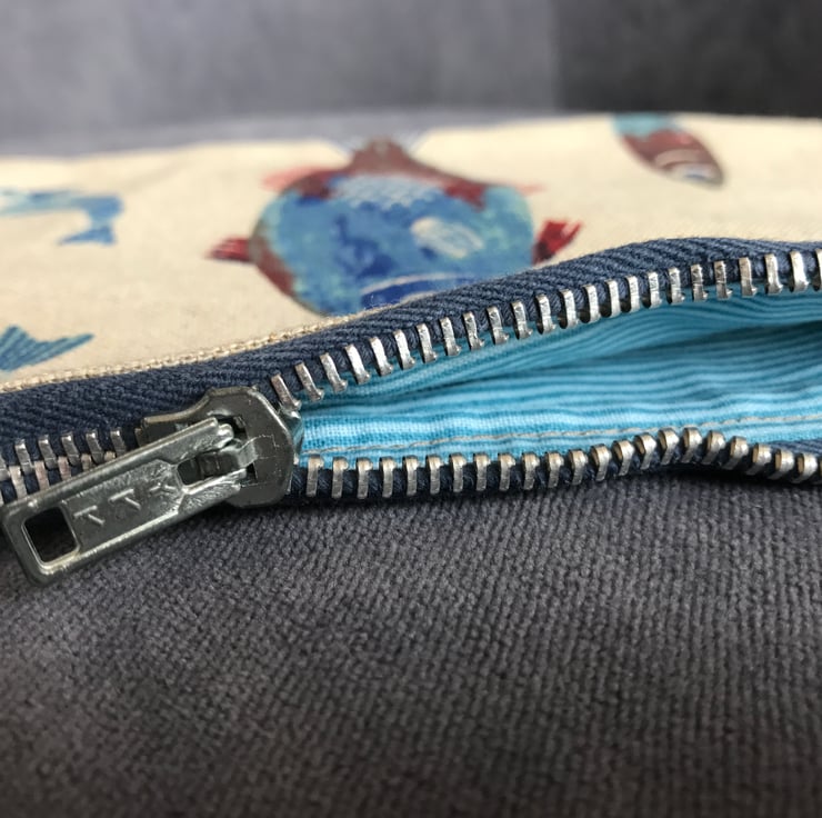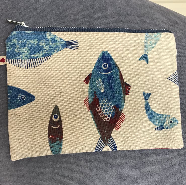 Useful zip-up pouch made from a linen-coloured cotton printed with fish. It is backed with red and white spotted cotton and fastens with a reclaimed metal zip. The pouch is a good size for makeup, pencils or craft bits.