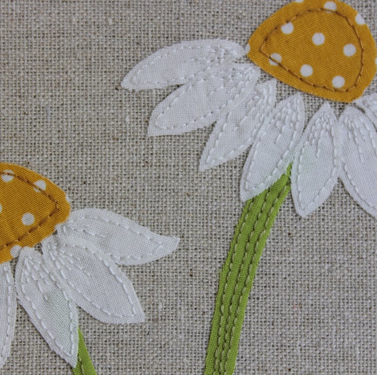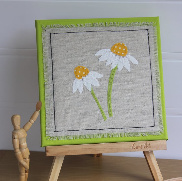 The daisies are surrounded by a machine stitched, black border to frame them, and the edges frayed to give a rustic appearance.