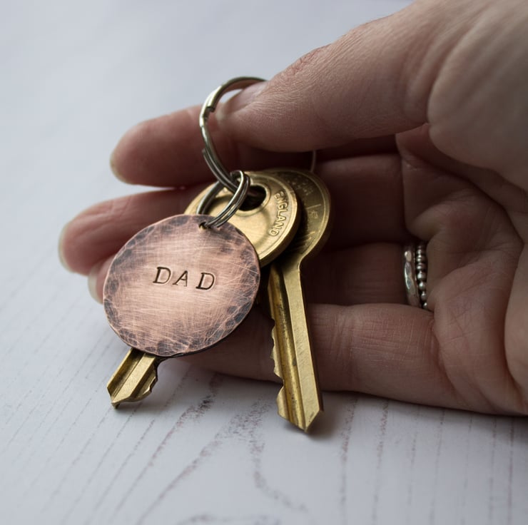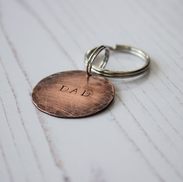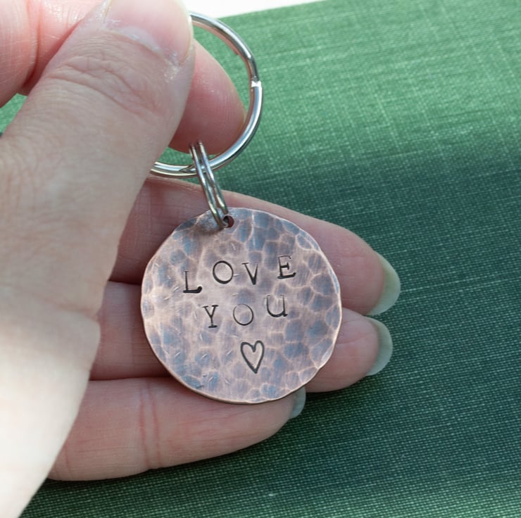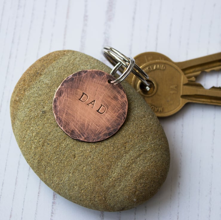 This copper keyring has hammered edges and is oxidised to highlight the letters and for a rustic look.