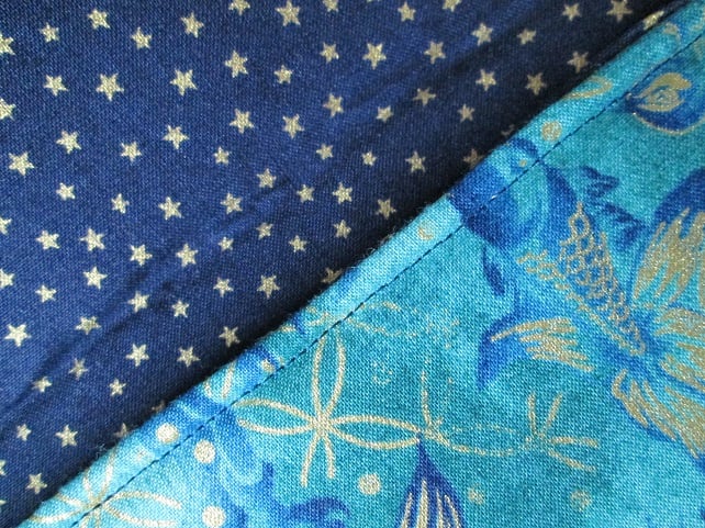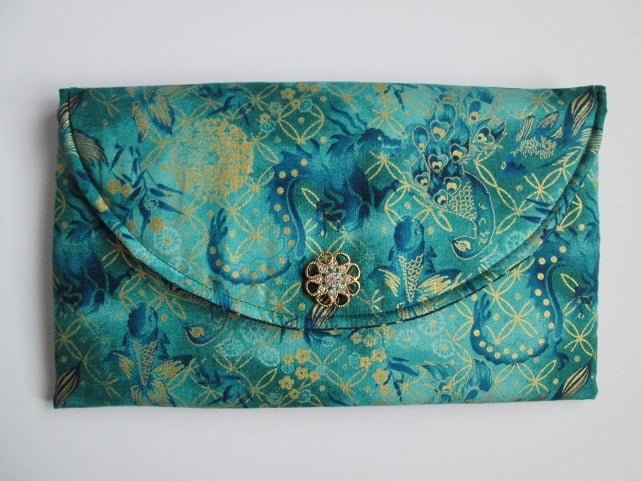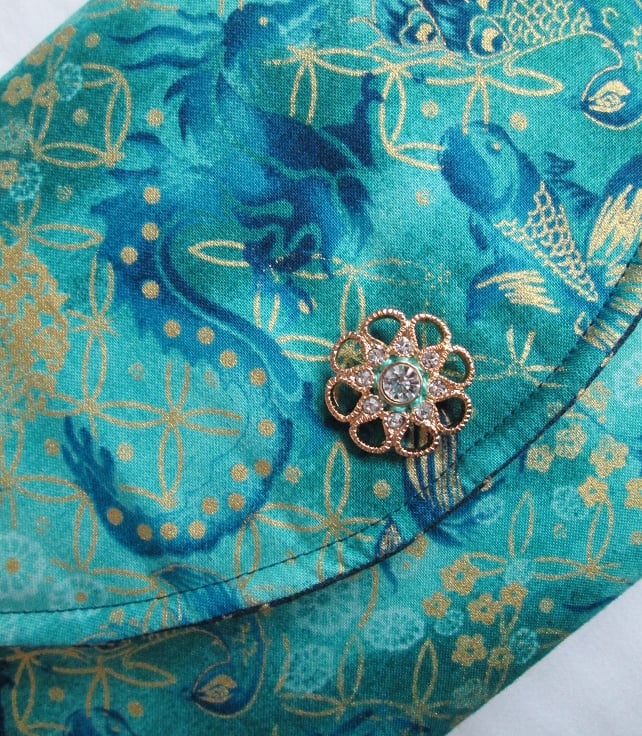 This neat clutch bag has been made with a stunning oriental print of blue dragons, peacocks and fish on a turquoise background. The metallic gold highlights are echoed with a sparkly filigree button set with clear diamante. It is lined with a navy cotton printed with tiny gold stars and has a magnetic fastening. Plenty big enough for your phone, keys, purse and lipstick, it's also very lightweight, so ideal for trips away.