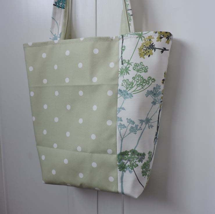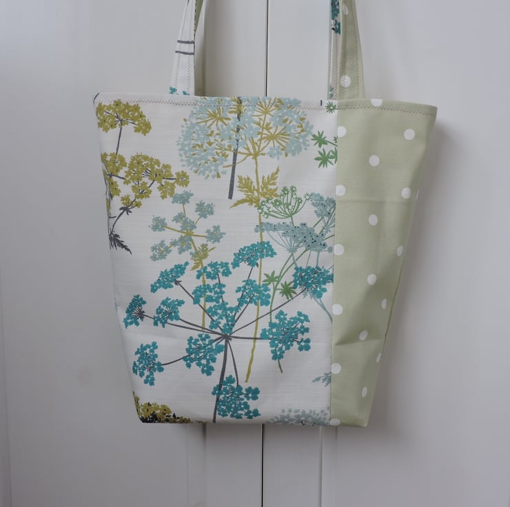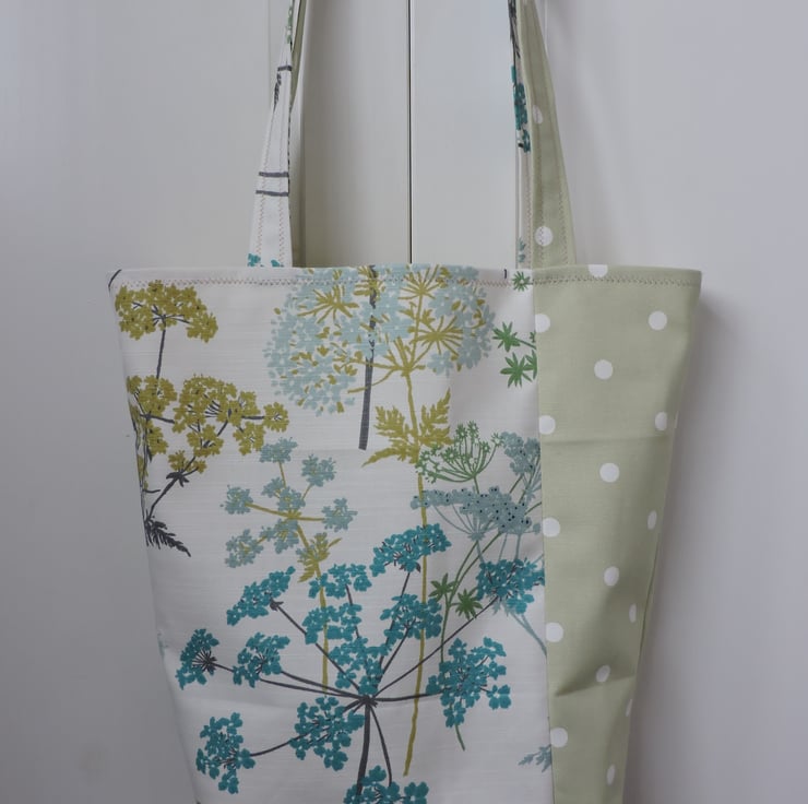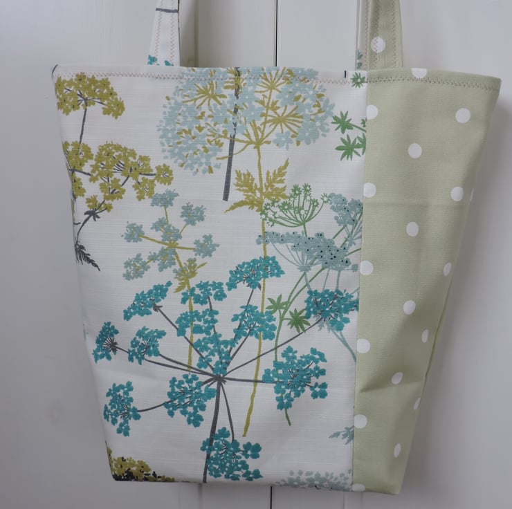 I've made this bucket shaped tote bag, shopping bag from two cotton duck fabrics, one has sage, olive, turquoise and aqua floral patten on a off white background and the other is a pale sage green with white spots.