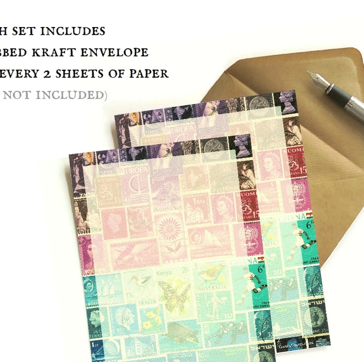 This letter set is decorated with a print of vintage world postage stamps, providing a perfect postal / travel-themed background for all your snail mail correspondence. The designs are reproduced from my original collage artwork. The designs are nicely non-specific, suitable for many different purposes and occasions.