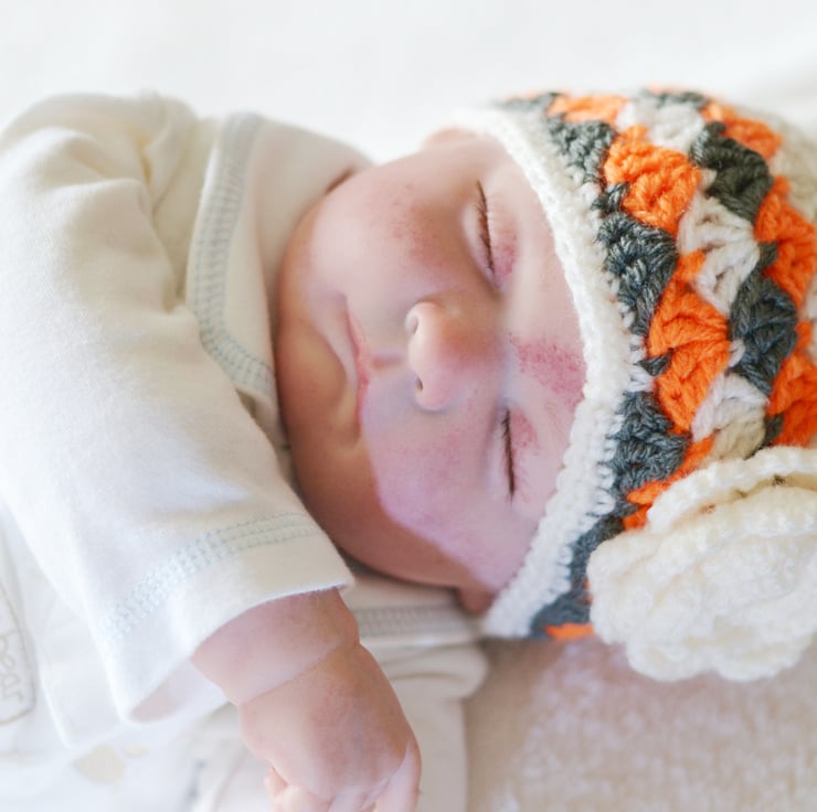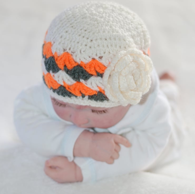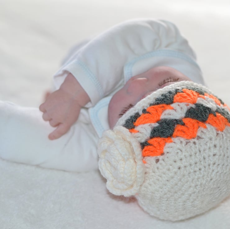Finished with a cream hand crochet rose which is sewn to one side of the hat