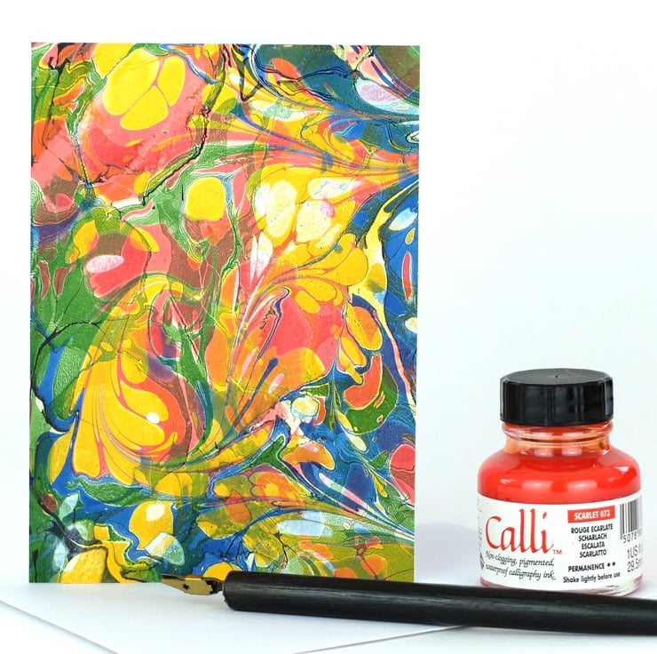 This vibrant handmade marbled greetings card features double marbling - a drawn stone pattern over a ordinary stone pattern. Cut from one of my own unique marbled papers which has then been securely adhered to 250gsm white card stock. The card comes with a matching envelope and in a cellophane bag.