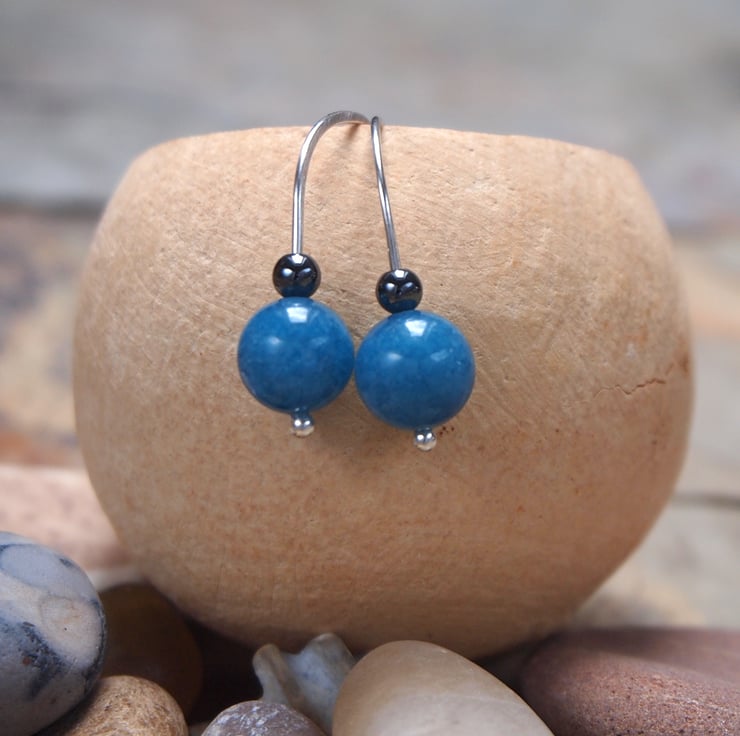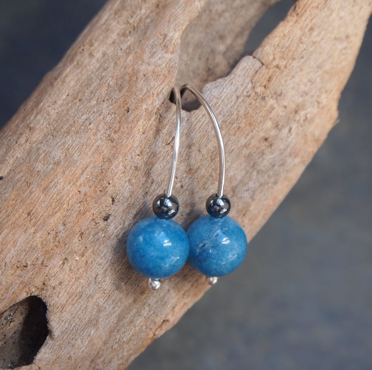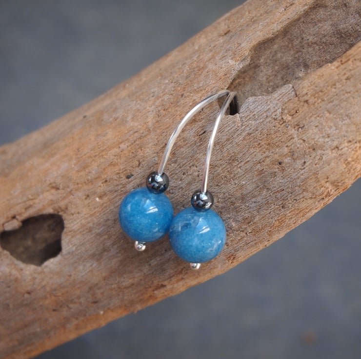 Turquoise blue kyanite has been teamed up with dark smokey grey hematite beads to make these simple silver drop earrings.