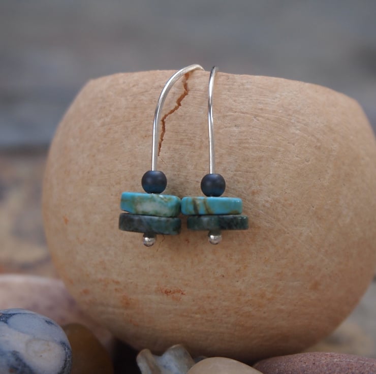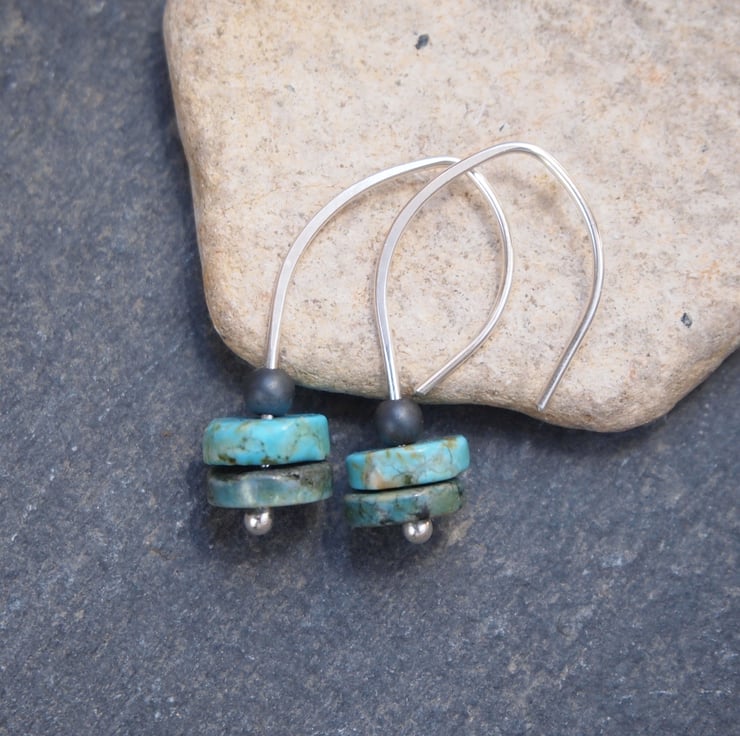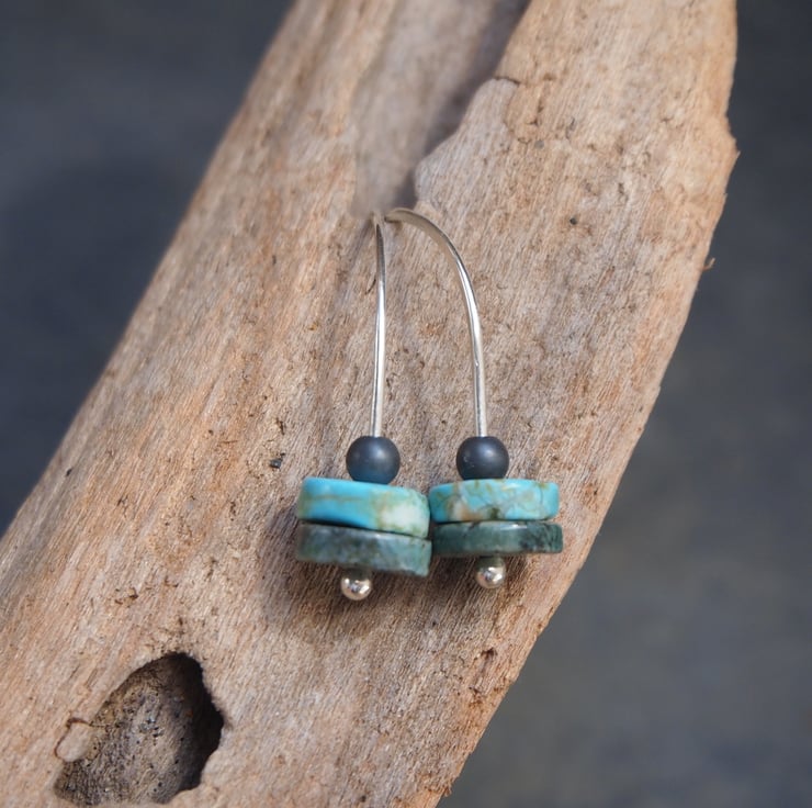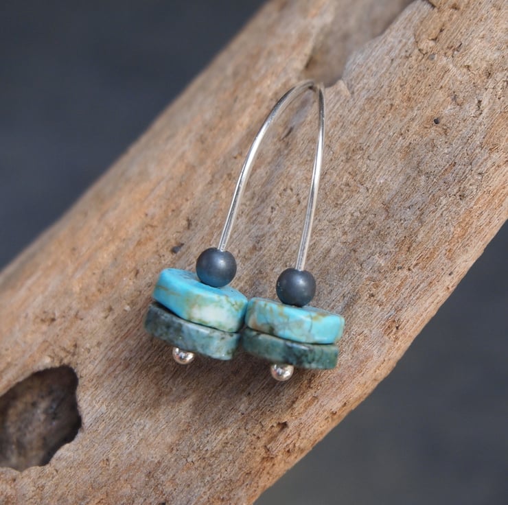 Silver drop earrings with round round discs of turquoise coloured magnesite. The magnesite beads have a rough cut giving them a lovely organic feel. They are teamed up with small matt grey hematite beads. The magnesite is a lovely turquoise in colour with veins of sand, cream and grey running through it.