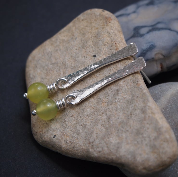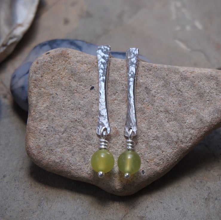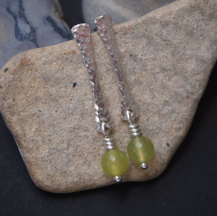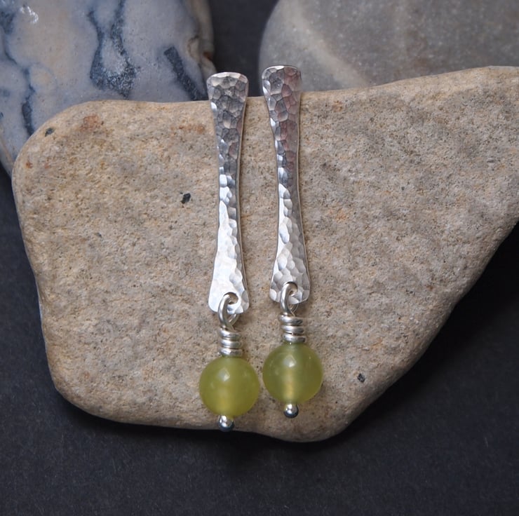 These stud earrings have been hand forged from rods of Argentium silver. The surface of the silver has been hammered to give a lovely sparkly texture. I have added a lime jade bead, this hangs by a twist of silver wire from the bottom of each earring.