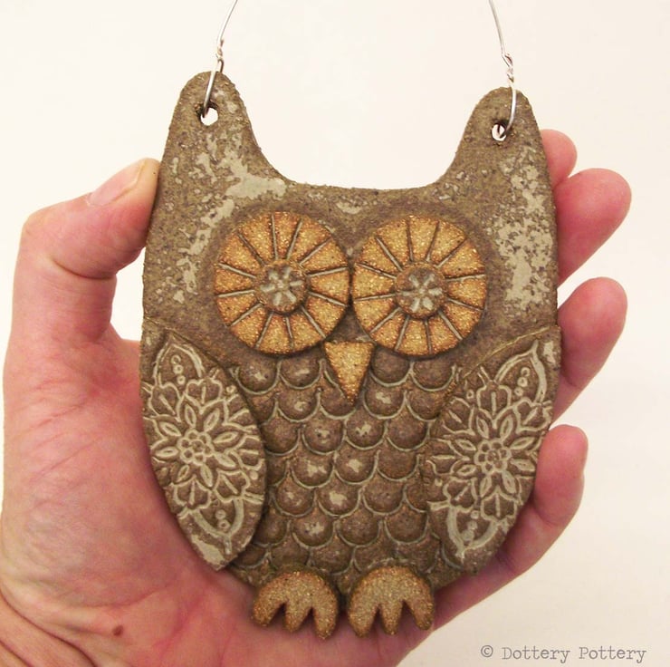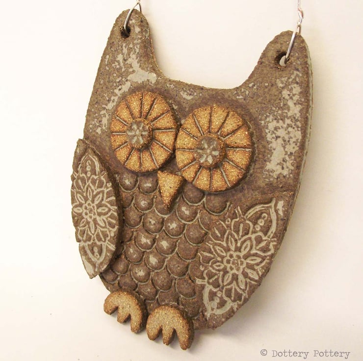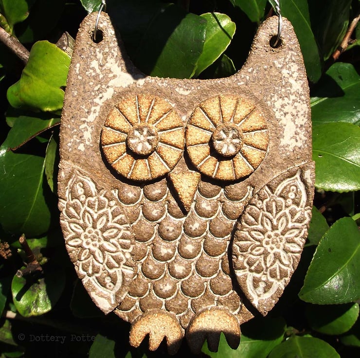 This cute ceramic owl is made from textured stoneware clay with all the individual pieces hand cut and decorated with pattern.