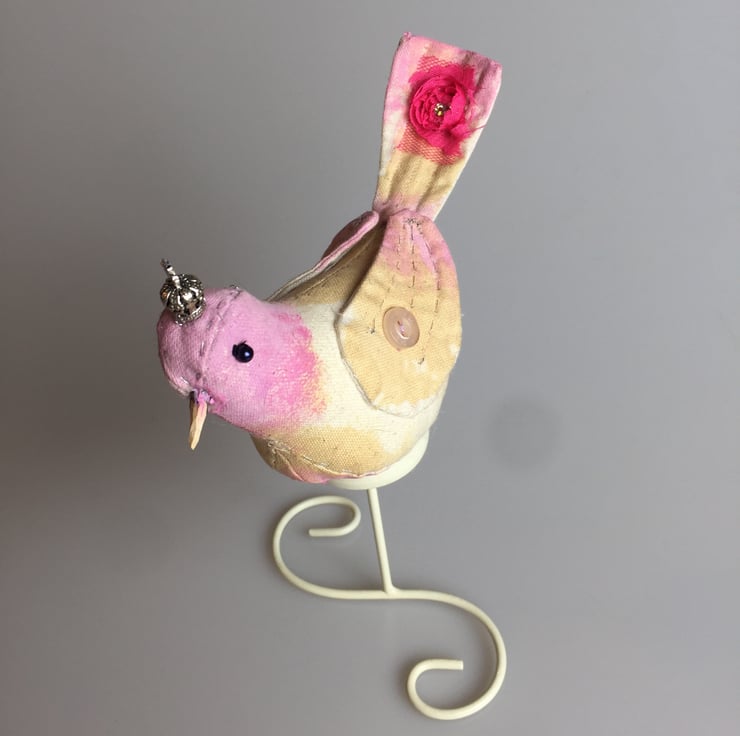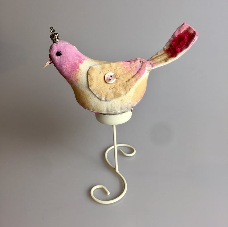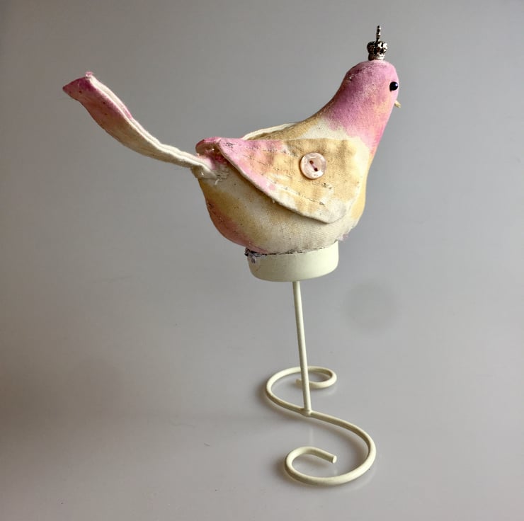 This pretty bird is hand and machined stitched, tea stained and painted in pinks mixed with lavender. Decorated with stitches in silver thread, pale little buttons on each wing, a cerise rose set with tiny shimmery sequins and a tiny metal silver coloured crown sits on its head. Mounted on a repurposed candle holder little bird can sing her heart out.