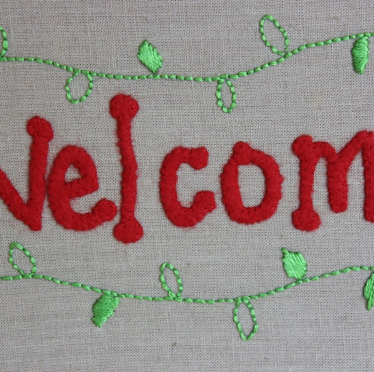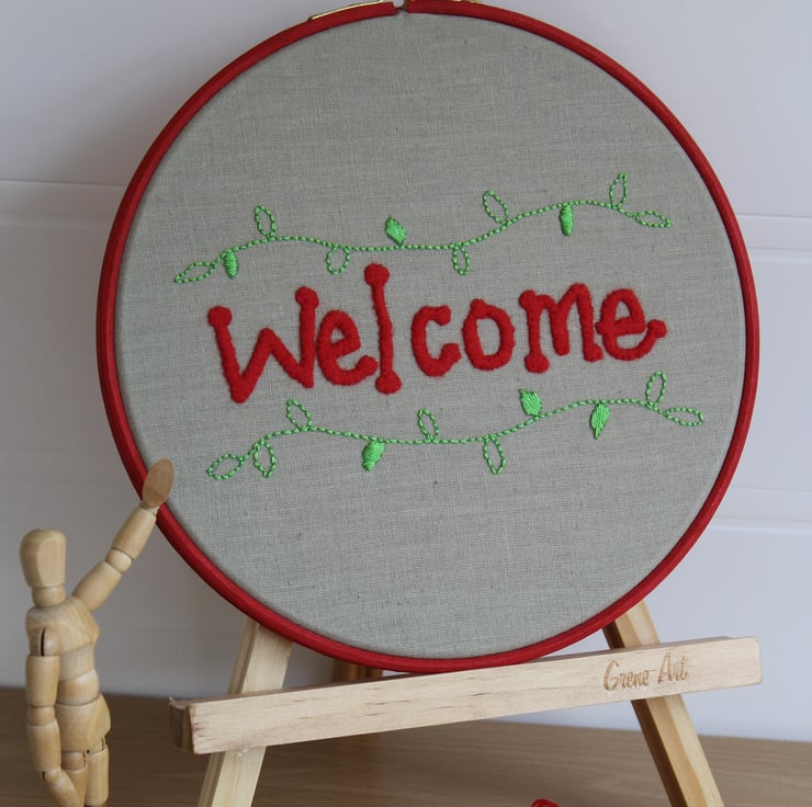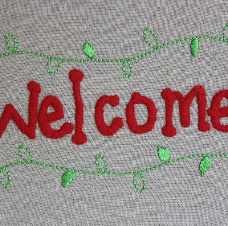 The embroidery hooped design features individually hand cut letters made from red felt to spell out the word 'welcome'. Leafy green vines were then hand embroidered above and below to decorate, and to contrast beautifully with the red lettering.