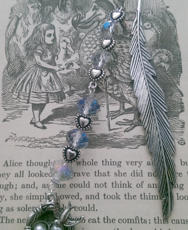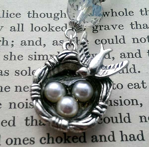 Feather bookmark with crystal & bird nest detail. This beautiful bookmark would make a perfect gift for the book worm in your life! The feather is 10 cm and the beaded chain with bird nest charm is approximately 11cm.