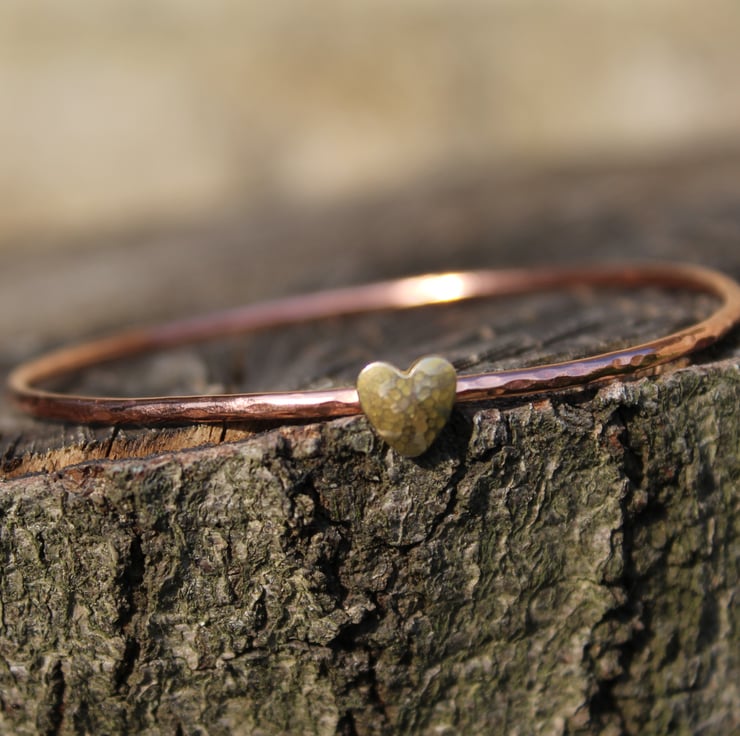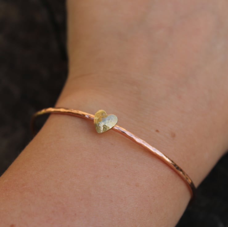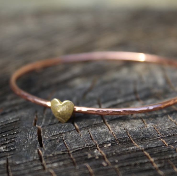 Hammered copper bangle with dappled brass gold heart.