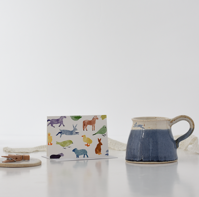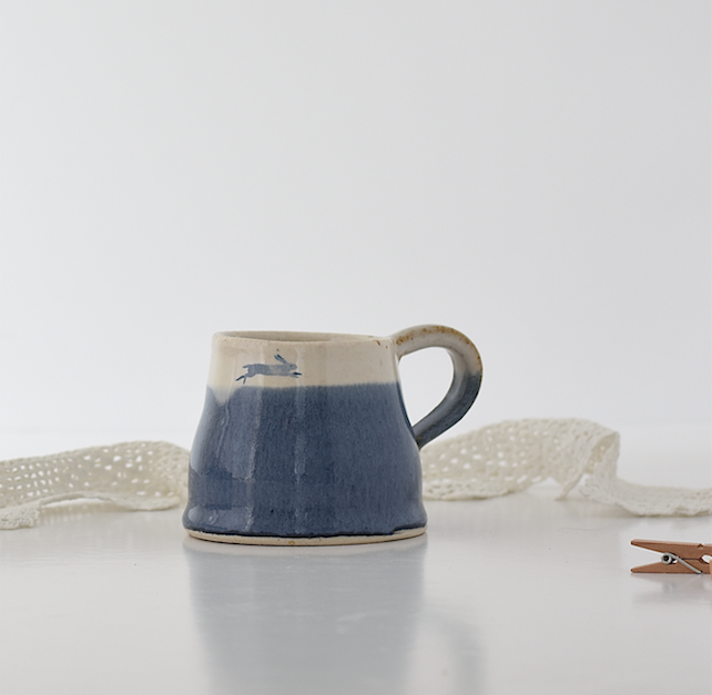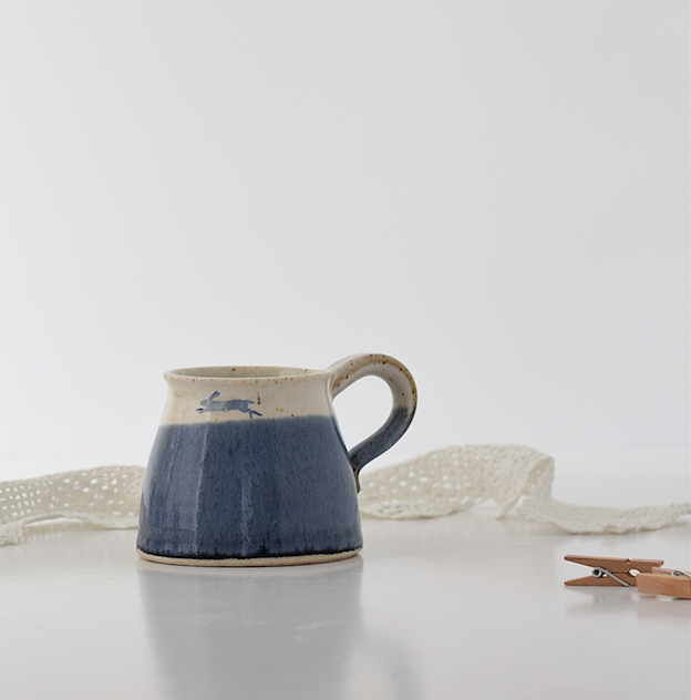 A rustic ceramic mug hand-thrown of strong white stoneware clay which fits comfortably in the hand. it's coated inside and out with my white and blue glazes. The leaping hare drawn by Zanna is fused deep into the glaze which makes the image as strong as the mug itself.