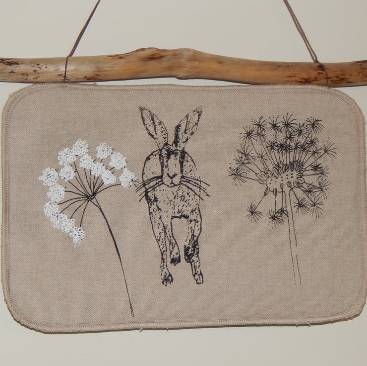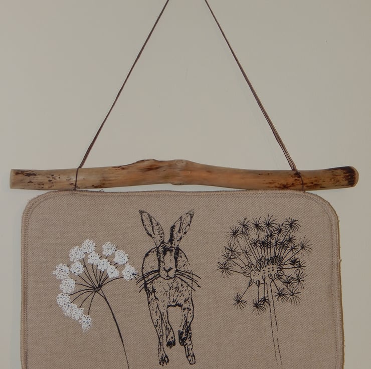 This is a screen printed Hare with cow parsley and a dandelion clock. Printed onto a beige cotton/linen fabric hung from a piece of Driftwood by waxed cord. There is beige zig zag stitching to the edges to stop fraying.
